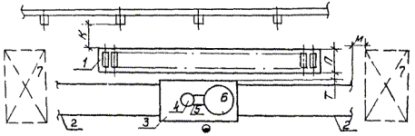 Рис. 4. Размещение установки велосипедной тележки для автоматической сварки продольных и кольцевых швов цилиндрических изделий: 1 - направляющий рельс; 2 - велосипедная тележка с балконом; 3 - сварочный автомат; 4 - сварочный узел; 5 - стенд роликовый механизированный; 6 - место складирования. Таблица 17
