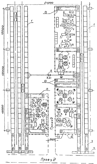 Рис. 13. Размещение конвейеров сборки, рихтовки и отделки изделий: 1 - конвейер; 2 - обрабатываемое изделие. Рис. 14. Гибкий автоматический участок сварки мелких узлов: 1 - высотный склад штамповок и узлов; 2 - кран-балка; 3 - рольганг; 4 - цепной конвейер; 5 - машина сварочная универсальная; 6 - робот промышленный для загрузки; 7 - робот для сварки; 8 - накопитель; 9 - стол поворотный для приспособлений; 10 - многоэлектродная машина; 11 - конвейер доварки; 12 - ограждение; 13 - подающее транспортное устройство. П - ширина зоны накопителя, конвейера (определяется конструктивно); Р - расстояние между конвейером и оборудованием; С - расстояние между конвейерами; Т - расстояние между тыльной и боковой сторонами оборудования или стендов; У - расстояние между боковыми сторонами оборудования или стендов; Ф - расстояние между стендом складирования и подвеской транспортного конвейера. Пример размещения оборудования и средств автоматизации для сварки мелких узлов на гибком автоматическом участке (ГАУ) с использованием роботехники, высотных складов с штабелерами и автоматической выдачей деталей к рабочим позициям показан на рис. 14. Расстояние от стен и колонн до оборудования следует принимать с учетом возможности обслуживания мостовыми или подвесными кранами. При расположении оборудования, рабочих мест у стен с остеклением, протирка которых производится с помощью напольных механизированных уборочных машин, ширина проезда определяется по габаритным размерам средств механизации, но не менее 1500 км. Нормы расстояния (см. табл. 15 - 25) между соседними единицами оборудования не распространяются на гибкие производственные системы, роботизированные и комплексно-автоматизированные участки. Эти расстояния определяются планом расположения оборудования конкретных участков, с учетом конструкции оборудования транспортно-складских систем, систем управления и условий обслуживания. При создании роботизированных технологических комплексов и участков следует соблюдать требования ГОСТ 12.2.072-82. Условные изображения и обозначения на планах расположения технологического оборудования должны соответствовать ГОСТ 21.107-78. Нормы ширины проездов принимать по табл. 26. Таблица 26