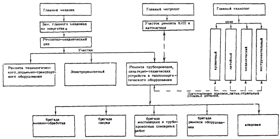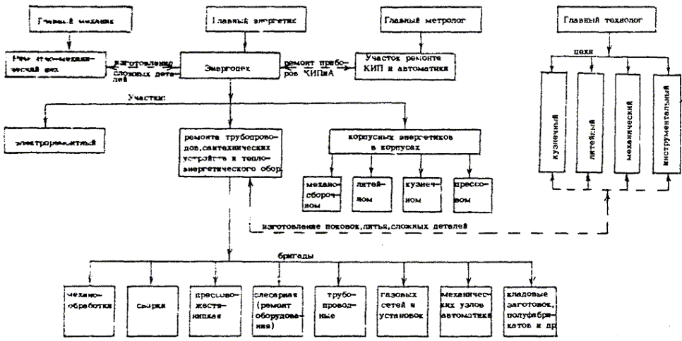 Показатели табл. 28 приведены из условий, что коэффициенты к трудоемкости по табл. 1 равны 1. Меньшие показатели производительности труда - в малых по размерам цехах и участках, большие - в крупных цехах. Приложение 1справочноеРис. 1 Организационная схема участка ремонта трубопроводов, санитарно-технических устройств и теплоэнергетического оборудования в ремонтно-механическом цехе предприятия с площадью крытых зданий до 100 тыс. м2. Рис. 2 Организационная схема участка ремонта трубопроводов, санитарно-технических устройств и теплоэнергетического оборудования в энергетике предприятия с площадью крытых зданий от 100 до 400 тыс. м2. Рис. 3 Организационная схема участка ремонта трубопроводов, санитарно-технических устройств и теплоэнергетического оборудования предприятия с площадью крытых зданий свыше 400 тыс. м2. ПриложениесправочноеПример расчета годовой трудоемкости цеха по ремонту трубопроводов, санитарно-технических устройств и теплоэнергетического оборудования (Цифры условные)1. Исходные данные