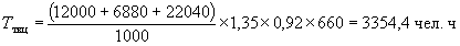 2. Имеется котельная, работающая на угле К5 = 1,35 3. Капитальный ремонт в объеме 20 % на стороне К3 = 0,87 4. Запасные части в объеме 30 % - со стороны К4 = 0,92 5. Трудоемкость на 1000 м2, чел. ч. Капитального ремонта (по гр. 2 табл. 1) - 240 Текущего ремонта и технологического обслуживания внекорпусных сетей и установок (по гр. 3 табл. 1) - 240 Текущего ремонта и технического обслуживания внутрикорпусных сетей и установок (по гр. 4 табл. 1) - главный корпус (66800) - 600 литейный корпус (43560) - 650 КВЦ (33022) - 690 механосборочный (44000) - 650 прессово-сварочный (36000) - 680 6. Расчет годовой трудоемкости: Капитального ремонта: Тк = 264,38 ´ 1,35 ´ 0,87 ´ 0,92 ´ 240 = 68561,6 чел. ч. Текущего ремонта внекорпусных сетей и установок: Ттр = 264,38 ´ 1,35 ´ 0,92 ´ 240 = 78806,4 чел. ч. Текущего ремонта внутрикорпусных сетей и установок выполняемого цехом: