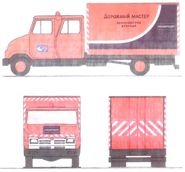 ПРИЛОЖЕНИЕ А(справочное) Пояснение понятий и терминов, используемых в настоящем стандартеЦветографические схемы - графическое наглядное изображение компоновки, конфигурации и композиционной взаимосвязи цветных плоскостей и опознавательных знаков наружных поверхностей машин. Основной цвет разработанной цветовой схемы - цвет покрытия, занимающий наибольшую плоскость на поверхности дорожных машин. В стандарте - это цвет чисто-оранжевый. Контрастирующие цвета разработанной цветовой схемы - цвета, отличающиеся между собой и от основного цвета по трем параметрам восприятия (цветовому тону, насыщенности, светлоте) и создающие различную степень контраста элементов цветовой композиции. Наибольший контраст между цветами достигается путем использования дополнительных цветов и сочетания ярких насыщенных цветов с ахроматическими (белыми, черными). Декоративные полосы (горизонтально-радиальная двухцветная конфигурация на боковых сторонах наружных поверхностей) - отличительный признак цветовой схемы дорожных машин, обеспечивающий их мгновенное зрительное восприятие и выделяющий машины из общего транспортного потока. Опознавательные знаки - графическое изображение информации, обладающее опознавательными признаками, по которым узнается ведомственная принадлежность дорожных машин (эмблема, логотип), их функциональная деятельность (информационные надписи) и возможная опасность (сигнально-предупреждающие полосы контрастирующих цветов). Эмблема - в настоящем стандарте это условное изображение символа дороги на основе начертания буквы «Ф» как знака принадлежности дорожных машин Федеральной дорожной службе России. Логотип - словесный знак организации. В стандарте - это графическое начертание сокращенного названия, т.е. аббревиатуры «ФДС России». Информационные надписи - текстовые названия основной функции дорожных машин на базе тех автомобилей, которые имеют другие назначения (например, надпись «Дорожный мастер. Контрольное звено» на машине, базой которой является микроавтобус ГАЗ, широко используемый для других назначений). Сигнально-предупреждающие полосы контрастирующих цветов - знак, информирующий о возможной опасности наезда на дорожные машины, работающие на дорогах стационарно или передвигающиеся, а также информирующий об опасных при эксплуатации рабочих органах дорожных машин (отвалы и т.п.). Эталонные цвета - заданные нормы цвета первого уровня точности, колориметрически аттестованные, без допускаемых цветовых отклонений. Норма цвета эмалей - контрольный образец (эталон) цвета, воспроизводящий заданные значения качественных показателей цвета в специально изготовленном образце (эталоне) цвета «Картотеки образцов (эталонов) цвета лакокрасочных материалов» или в заводском контрольном образце цвета эмали или краски, колориметрически аттестованные, с допускаемыми цветовыми отклонениями. Изготовители эмалей предоставляют потребителям эмалей дубликаты контрольных образцов (эталонов) цвета. Норма цвета импортных пленок - контрольный образец цвета пленки, соответствующий эталону цвета цветового регистра или атласа цветов, принятых в стране - изготовителе пленок. ПРИЛОЖЕНИЕ Б(обязательное) Цветографические схемы дорожных машин