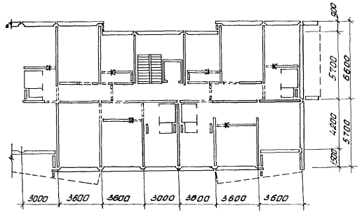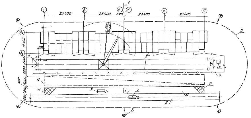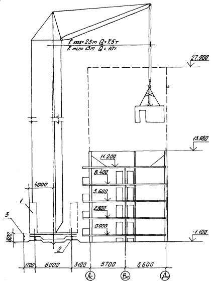 Технологическая схема выполнения строительного процесса 1 - башенный кран КБ-405.1А; 2 - подкрановый путь; 3 - ограждение подкранового пути; 4 - контур заземления; 5 - контрольный груз; 6 - полуприцеп-панелевоз; 7 - тягач; 8 - прожекторы; 9 - временная автодорога; 10 - площадка разгрузки автотранспорта; 11 - площадка для приема раствора; 12 - временная открытая площадка складирования; 13 - граница зоны работы крана. Рис. 1 Разрез 1-1