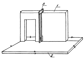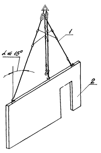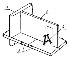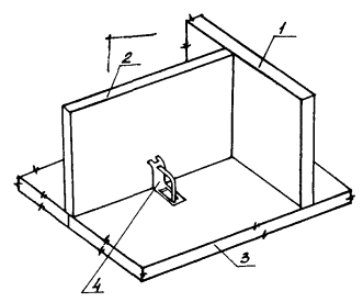 Рис. 2 Схема строповки панели перегородки 1 - четырехветвевая самобалансирная траверса; 2 - панель перегородки Рис. 3 Схема установки низа панелей перегородок с помощью шаблона 1 - стеновая панель; 2 - устанавливаемая панель перегородки; 3 - плита перекрытия; 4 - шаблон для установки низа панелей Рис. 4 Схема контроля монтажа панелей перегородок с помощью рейки-отвеса 1 - установочная плоскость панели перегородки; 2 - плита перекрытия; 3 - рейка-отвес Рис. 5 Расположение приспособлений при монтаже панелей перегородок (на примере торцевой блок-секции 90-07 (1.2) Стойка треугольная (угловая) для крепления панелей перегородок Рис. 6 Комплект монтажного оснащения