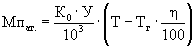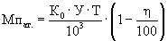 где: η - степень очистки воздуха пылеулавливающим оборудованием, (%), определяется по результатам последних наладочных испытаний или паспортным данным. В случае отсутствия последних по Приложению 2.2.5. Формула применима в том случае, если время работы технологического оборудования равно времени работы пылеулавливающей установки. При меньшем времени работы пылеулавливающей установки (ремонт или др. причины) по сравнению со временем работы технологического оборудования количество выбрасываемого в атмосферу загрязняющего вещества (т/год) определяется по формуле: