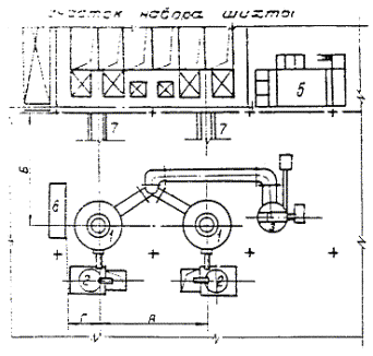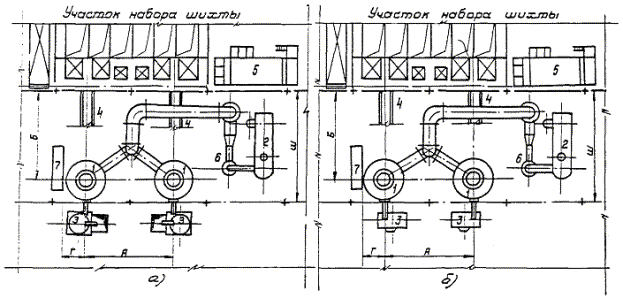 Примечания: 1. В таблице даны минимально необходимые размеры, которые следует уточнять при общей компоновке плавильного цеха или участка. 2. Высоту до уровня пола при установке вагранок на 2-м этаже следует определять по формовочно-заливочному цеху или участку. 3. В случае установки мостовых кранов для отбора жидкого металла их грузоподъемность следует определять по максимальной массе заполненного ковша с учетом приведенной в таблице грузоподъемности подъемно-транспортных средств для обслуживания. 4. Вместимость миксеров следует определять в зависимости от организации технологического процесса с учетом данных таблицы. 5. Допускается размещение миксеров, отличное от показанных на схемах. 6. Типы, производительность и размеры вагранок должны соответствовать требованиям ГОСТ 24774-81. Рис. 1. Схема установки вагранок закрытого типа с миксерами типа ИЧКМ (а) и копильниками с газовым обогревом (б): 1 - вагранка; 2 - рекуператор; 3 - миксер или копильник; 4 - скиповый подъемник; 5 - система гидрошламоудаления; 6 - система газоочистки; 7 - пульт управления Рис. 2. Схема установки вагранок в одноэтажном (а) и двухэтажном (б) зданиях Рис. 3. Схема установки вагранок открытого типа с миксерами ИЧКМ: 1 - вагранка; 2 - миксер; 3 - воздухоподогреватель; 4 - пылеосадитель; 5 - система гидрошламоудаления; 6 - пульт управления; 7 - скиповый подъемник