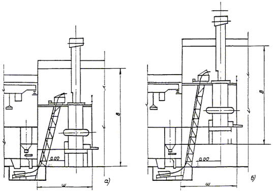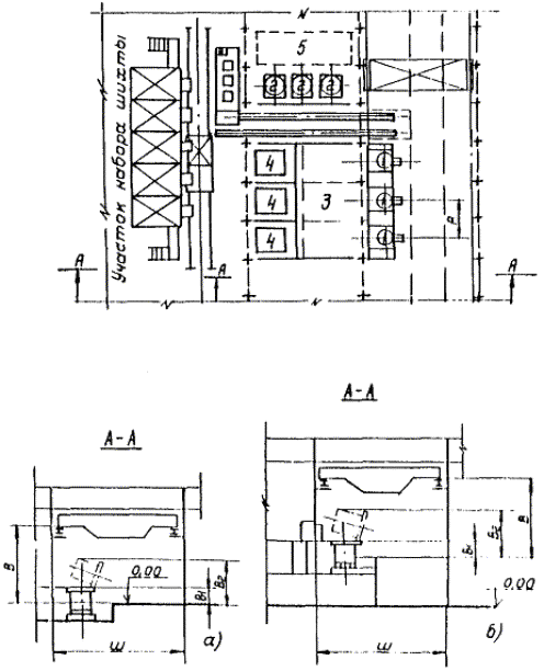 Рис. 4. Схема установки индукционной тигельной печи промышленной частоты: 1 - индукционная тигельная электропечь ИЧТ; 2 - установка для подогрева шихты; 3 - помещение конденсаторных батарей; 4 - трансформаторная подстанция; 5 - установка газоочистки; а) одноэтажное здание; б) двухэтажное здание. Нормы размеров пролетов, грузоподъемных средств плавильных участков, оборудованных индукционными тигельными электропечами промышленной частоты, и расстояний между ними приведены в табл. 47, см. рис. 4. Таблица 47