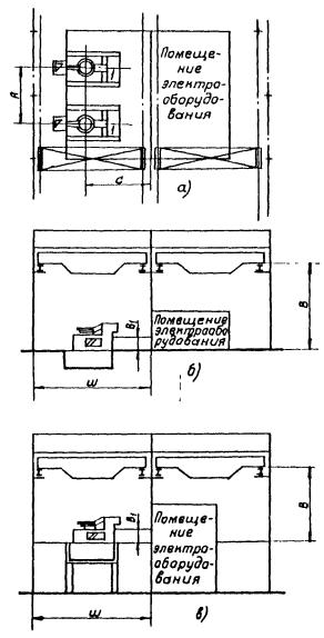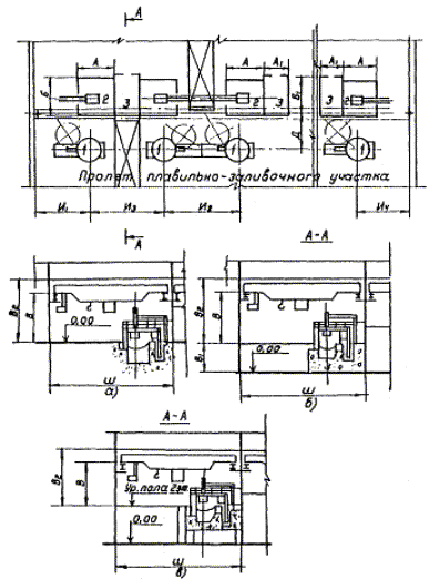Рис. 7. Схема установки индукционных тигельных электропечей (1) повышенной частоты (а) в пролетах одноэтажного (б) и двухэтажного (в) зданий Нормы размеров пролетов и грузоподъемности однобалочного крана участков цехов крупносерийного и массового производств отливок массой до 200 кг приведены в табл. 53. Таблица 53