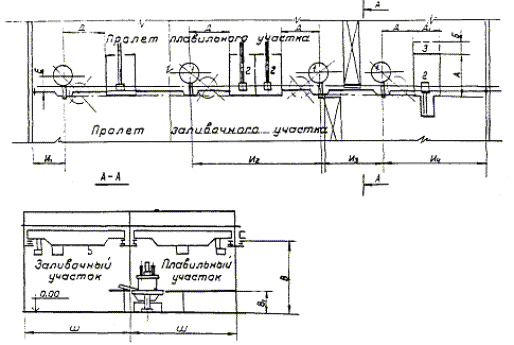 Примечания: 1. Нормы площади учитывают установку основного, вспомогательного, роботов, манипуляторов, приемно-передающих и ориентирующих устройств, оргоснастки и прочего оборудования, необходимого для ГПМ, а также транспортные средства, проходы и проезды за исключением магистральных. 2. Площадь, необходимая для размещения ГПК, определяется как сумма площадей ГПМ, входящих в ГПК с учетом коэффициента 0,8 - 0,9 в зависимости от количества ГПМ (до 3-х ГПМ принимать коэффициент - 0,9, свыше трех - 0,8). 6.3. Основные строительные параметры зданий, грузоподъемность транспортных средств, нормы расстояний между оборудованием и строительными элементами зданийНормы размеров пролетов и грузоподъемных средств плавильных участков, оборудованных вагранками с подогревом дутья и очисткой газов, приведены в табл. 46, см. рис. 1, 2, 3 Таблица 46