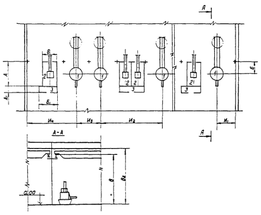 Примечания: 1. Расстояние обслуживаемого краном оборудования от стен и колонн должно обеспечивать нормальное положение крана над оборудованием. 2. При установке оборудования на индивидуальном фундаменте расстояние от оборудования до стен, колонн и соседнего оборудования следует принимать с учетом конфигурации смежных фундаментов. 3. Расстояния указаны от оборудования с учетом ограничения движущихся частей. 4. Нормативные данные таблицы не относятся к подъемно-транспортному оборудованию. 5. Минимальный размер рабочей зоны и ширина проходов принимаются равными 800 мм. 6. Минимальное расстояние от оборудования до проезда со стороны рабочей зоны равно 1300 мм. 7. При размещении оборудования (или блоков оборудования) между колоннами расстояние до колонн следует определять конструктивно, в этом случае проход следует проектировать в обход колонн. Рис. 9. Схема расположения оборудования и электропечей