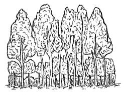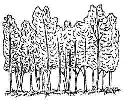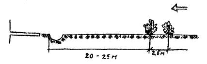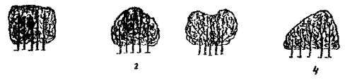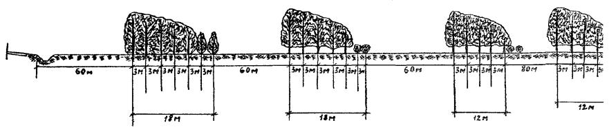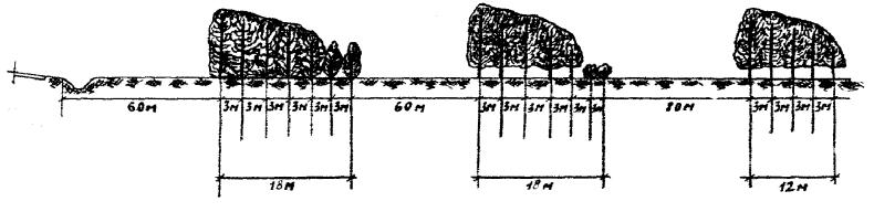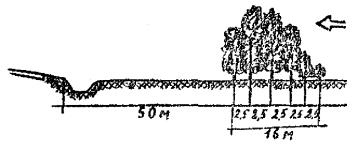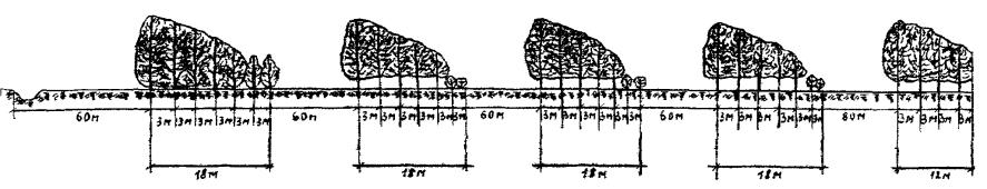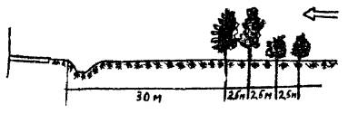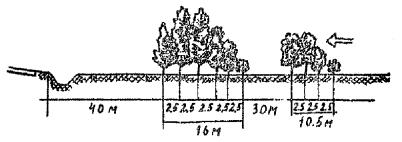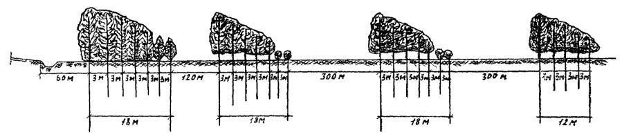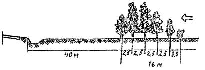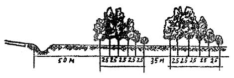 где: L - ширина зоны отвода, в которую входит ширина снегозащитных кулис в метрах, вместе с разрывами между ними и расстоянием от бровки земляного полотна до первого ряда снегозащитной полосы (X). Smax - площадь поперечного сечения снежного вала в годы наибольших заносов (м2). hp - высота рабочей части насаждения (средняя высота снежного вала в полосе). В зависимости от объемов снегозаноса древесные насаждения располагаются на снегосборном бассейне следующим образом. Рис. 7. Размещение древесно-кустарниковой кулисы при снегозаносимости до 75 м3/п.м. Рис. 8. Размещение древесно-кустарниковой кулисы при снегозаносимости до 100 м3/п.м. Рис. 9. Размещение древесно-кустарниковых кулис при снегозаносимости до 150 м3/п.м. Рис. 10. Размещение древесно-кустарниковых кулис при снегозаносимости до 200 м3/п.м. Для участков дорог с объемом снегозаноса до 25 м3/п.м рекомендуется густая двухрядная посадка кустарников на расстоянии 20 - 25 м от бровки земляного полотна (рис. 5). На участках дорог с объемом снегозаноса до 50 м3/п.м закладывается одна четырехрядная древесно-кустарниковая кулиса на расстоянии 30 м от бровки земляного полотна, при этом два ряда с полевой стороны устраивают из кустарников и два ряда с дорожной стороны - из густоветвистых низкокронных деревьев (рис. 6). Надежной защитой для участков дорог с объемом снегозаноса до 75 м3 п/м служит шестирядная древесно-кустарниковая кулиса, заложенная на расстоянии 40 м от бровки земляного полотна дороги. В такой кулисе кустарники занимают крайние ряды (рис. 7). На участках дорог со снегозаносом до 100 м3/п.м закладывают древесно-кустарниковую кулису на расстоянии 40 м от бровки земляного полотна в сочетании с двухрядной посадкой кустарников, размещенных на расстоянии 15 м от кулисы в сторону поля (рис. 8). Участки дорог со снегозаносом до 150 м3/п.м надежно защищает система из двух узких древесно-кустарниковых кулис, в которой ближе к дороге располагаемая шестирядная кулиса на расстоянии 40 м от бровки земляного полотна, а со стороны поля четырехрядная кулиса на расстоянии 30 м от шестирядной кулисы (рис. 9). Для участков дорог со снегозаносом до 200 м3/п.м закладывают систему из двух шестирядных древесно-кустарниковых кулис с разрывом между ними в 35 м. При этом ближайшую к дороге кулису размещают на расстоянии не ближе 50 м от бровки земляного полотна (рис. 10). Для таких снегозащитных насаждений рекомендуются ветвистые древесные породы с низко опущенной кроной и высокорастущими кустарниками. Небольшое количество рядов в кулисах компенсируется загущением посадки в рядах с расстоянием между стволами через 0,4 м и уширением междурядий до 2,5 - 3,0 м, что обеспечивает повышение площади питания растений и возможность механизации обработки почвы и ухода за полосами. Опытная проверка характера снежных отложений у экспериментальных лесных полос вдоль автомобильных дорог свидетельствует о надежной защите их при слабой степени заносимости до 200 м3/п.м. В условиях севера Казахской ССР автомобильные дороги проходят в основном по равнинным участкам степей, где снег переносится на большие расстояния и дороги, следовательно, подвергаются более значительным взносам. Объемы снежных отложений на автомобильных дорогах достигают 300 - 400 м3/п.м, а в более снежные зимы - 600 - 700 м3/п.м с максимумом на отдельных участках до 1200 м3/п.м. Плотные конструкции 