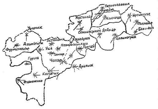 В таблице, кроме процентного выражения повторяемости метелистых ветров по отдельным румбам, приведены суммы повторяемости ветров противоположных румбов (С + Ю; CB + ЮЗ; В; СЗ + ЮВ) и разность между наибольшей суммой повторяемости направления ветра и суммой повторяемости направлений, перпендикулярных им. Эти вспомогательные подсчеты рекомендованы для определения показателя выгодности расположения снежных траншей. Разность между наибольшей суммой повторяемости противоположных направлений ветра и суммой повторяемости противоположных направлений, перпендикулярных им, являются характерными величинами для оценки более точного расположения снежных траншей против вредоносных ветров. Так, например, если по Петропавловску наибольшая сумма повторяемости противоположных направлений ветра (CB+ ЮЗ) равна 50 %, а сумма повторяемости противоположных направлений, перпендикулярных им (СЗ + ЮВ) - 16 %, то здесь наивыгоднейшее направление снежных траншей с СЗ на ЮВ с показателем выгодности в 34 % и т.д. Это говорит о том, что снежные траншеи при таком направлении будут воспринимать на себя силу ветра на 34 % больше, чем при направлении с СВ на ЮЗ. Рис. 14. Схематическая карта северной половины Казахской ССР с розами метелистых ветров. На нижеприведенном рисунке (рис. 14), по данным этой таблицы, в северной половине Казахстана выделено два сектора с преобладающим направлением ветров, разделенные между собой линией Карабутак-Челкар-Аральск. В секторе, расположенном к востоку от этой линии, явно выражено преобладание юго-западных ветров, а в секторе, расположенном к западу от данной линии, преобладают юго-восточные и восточные ветры. Поэтому наиболее рациональное направление снежные траншеи в первом секторе будут иметь при их расположении с северо-запада на юго-восток, а во втором - с северо-востока на юго-запад и в меридиональном направлении. Конечно, в каждом конкретном пункте ветровой режим может иметь свои особенности, что необходимо учитывать для каждого участка дороги. Пропашку первых траншей целесообразно начинать с начала зимы при незначительной толщине снежного покрова. При этом, при наличии снегозащитных насаждений или механических преград, траншеи проводят по наветренному снежному шлейфу, собранному этими преградами, и дальше в сторону поля. Исключительно важную роль имеет применение этой меры при слишком близком расположении снегозащитных полос вдоль дорог или значительной их изреженности, а также при отработке лесных полос и при наличии молодых насаждений. По мере заносимости снежных траншей высота их гребня при повторных пропашках увеличивается и снегозадерживающее действие траншей усиливается. Поэтому нужно добиваться наибольшей глубины траншей и высоты снежных валов. Для полного использования снегозадерживающей способности траншей необходимо их располагать друг от друга на расстоянии, равном сумме длин наветренного и подветренного шлейфов, что соответствует 15 высотам вала траншеи. Таким образом, при высоте вала от 1,0 до 1,5 м расстояние между центрами соседних траншей должно быть равным 15 - 20 м. Устройство таких траншей производится тракторными двухотвальными снегоочистителями, бульдозерами, прицепными угольниками, кусторезами и т.п., а при незначительном снежном покрове лучше использовать валообразователи (риджеры) и 