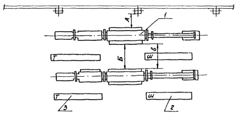 Примечания: 1. При установке оборудования на индивидуальные фундаменты, указанные в таблицах размеры уточняются по чертежам принятого в проекте калибровочного оборудования с учетом габаритов фундаментов и строительных конструкций. 2. Размеры расстояний даны с учетом обслуживания оборудования роботами типа «Универсал 5-03» 3. Размеры «В», «Г» и «Е» даны с учетом проездов.