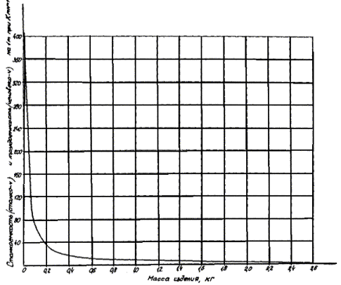 Примечания к таблице 40: 1. Выпуск в год приведен для среднесерийного производства при годовом выпуске 1000 - 5000 т при наиболее типичном соотношении технологических схем: однократное прессование (конструкционные материалы) - 40 %; двойное прессование (конструкционные материалы) - 10 %; штамповка (конструкционные материалы) - 20 %. 2. Для определения данных для мелкосерийного производства следует применить коэффициент 0,8, для крупносерийного и массового производства соответственно - 1,15. Определение станкоемкости и технологической трудоемкости на 1 т для операций подготовки и приготовления шихты, спекания, маслопропитки, термообработки и др. График 1 Определение станкоемкости и технологической трудоемкости на 1 т для операции прессования