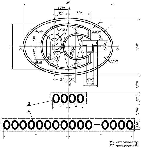 Рисунок А.3 Рисунок А.4 Приложение Б(обязательное) Графическое изображение знака соответствия национальным стандартам1 - графическое изображение знака соответствия национальным стандартам; 2 - овал (эллипс) с центром в точке пересечения осей АА и ВВ; 3 - код органа, выдавшего разрешение на право применения знака соответствия национальным стандартам; 4 - обозначение национального стандарта Рисунок Б.1 Приложение В(обязательное) Шрифт для нанесения кода органа, выдавшего разрешение на право применения знака соответствия национальным стандартам, и обозначения национального стандартаРисунок В.1 Приложение Г(обязательное) Форма разрешения на право применения знака соответствия национальным стандартам