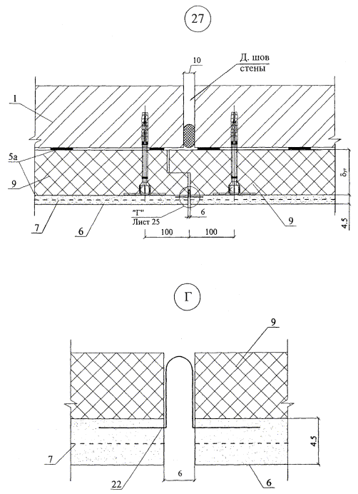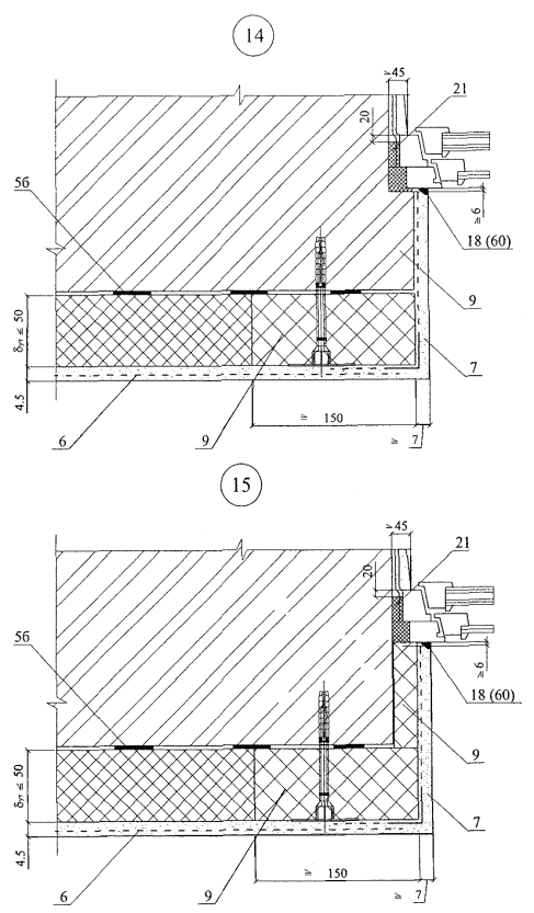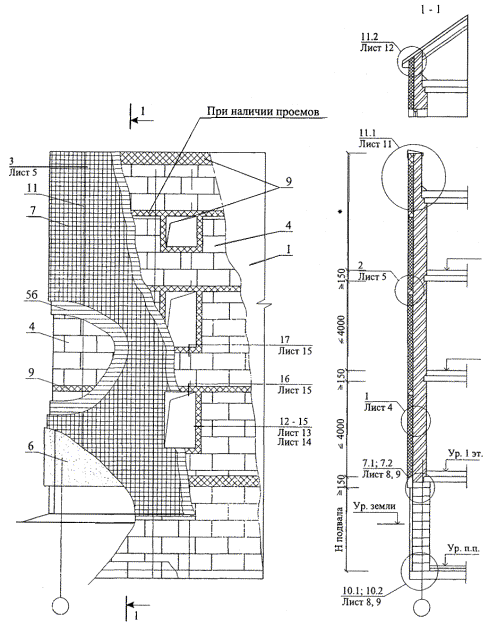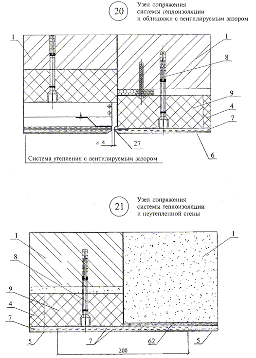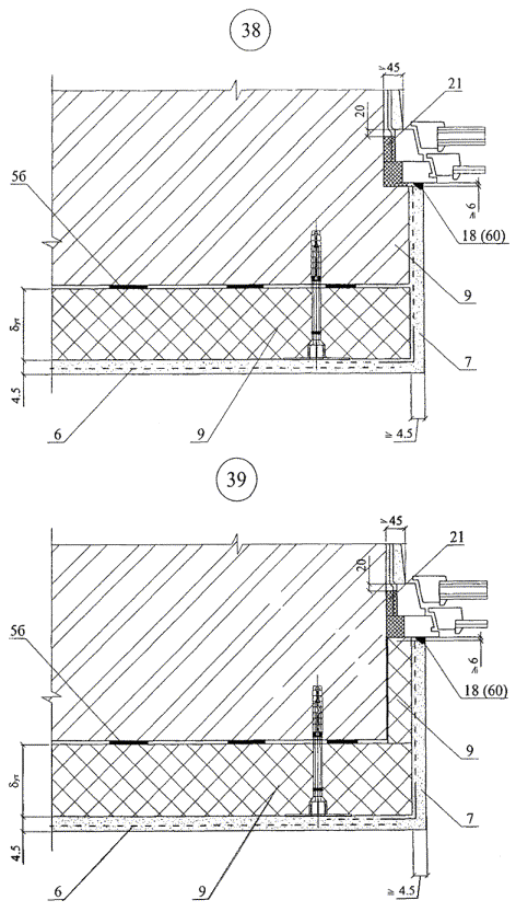 4. КОНСТРУКТИВНЫЕ РЕШЕНИЯ СТЕН4.1. Стена при новом строительстве может быть несущая или самонесущая и представляет собой трехслойную конструкцию с несущим слоем из полнотелого глиняного кирпича толщиной 380 мм или 510 мм, а также из бетонных блоков или монолитного железобетона со слоем теплоизоляции из плитного пенополистирола типа ПСБ-С или минераловатной плиты на синтетическом связующем с защитным слоем толщиной 4,5 мм из штукатурки Ceresit СТ 190 (ТУ 5745-008-58239148-03) - для минплиты, Ceresit CT 85 (ТУ 5745-008-58239148-03) - для ПСБС. 4.2. При защитно-декоративном слое из штукатурки необходимо, чтобы: - защитная штукатурка имела нулевой предел распространения огня и была армирована щелочестойкой стеклосеткой; - толщина ее составляла 4,5 мм (кроме цоколя) и не менее 7 мм - в цокольной части; - при теплоизоляции из пенополистирола следует предусматривать рассечки из негорючих материалов (в нашем случае - из минераловатных плит) на всю толщину слоя теплоизоляции и высотой не менее толщины перекрытия, но не менее 150 мм в соответствии с рекомендациями, изложенными в приложении 4 «Обеспечение пожарной безопасности». 4.3. Теплоизоляционные плиты крепят к несущему слою стены на клею и дополнительно распорными дюбелями. При подготовке несущей части стены до закрепления к ней теплоизоляции рекомендуется использовать при необходимости: антигрибковый препарат Ceresit CT 99; смывку высолов Ceresit CL 55; грунтовки Ceresit CT 16 и Ceresit CT 17 (ТУ 5745-008-58239148-03), выравнивающую штукатурку и шпатлевку Ceresit СТ 29 (ТУ 5745-007-58239148-03). 4.4. Для наклейки минераловатных плит рекомендуется использовать клей Ceresit CT 190, а пенополистирольных плит - Ceresit CT 83 или Ceresit CT 85 (ТУ 5745-008-58239148-03), которые характеризуются прочностью сцепления с основанием не менее 0,9 МПа, морозостойкостью не менее 75 циклов и величиной линейной усадки не более 0,5 %. 4.5. Клей следует наносить на теплоизоляционную плиту с помощью штукатурного шпателя валиком (шириной 4 - 6 см) по всему периметру с отступлением от краев на 2 - 3 см и дополнительно «куличами» на остальную поверхность плиты, при этом площадь приклеенной поверхности плит - не менее 40 %. 4.6. Установку плит в проектное положение осуществляют с прижатием к поверхности несущей части стены и выравниванием по высоте относительно друг друга трамбовками. Образование излишков выступающего клея недопустимо. 4.7. Выравнивание по горизонтали теплоизоляционных плит может осуществляться с помощью временно закрепленной к несущей части стены деревянной рейки или с применением цокольного профиля (изготовленного из алюминия или оцинкованной стали) толщиной 1 - 1,5 мм, который закрепляют к несущей части стены дюбелями, расположенными с шагом не более 300 мм. 4.8. При установке цокольных профилей необходимо оставлять зазор в стыке между ними 2 - 3 мм. Для выравнивания вдоль несущей части стены необходимо использовать соответствующие подкладочные шайбы из ПВХ, а для соединения профилей между собой - пластмассовые соединительные элементы. 4.9. После установки первого ряда теплоизоляционных плит на цокольный профиль зазор между поверхностью несущей части стены и профилем необходимо заполнить полиуретановой пеной. 4.10. Теплоизоляционные плиты устанавливают вплотную друг к другу. В случае если между ними образуются зазоры более 2 мм, их необходимо заполнить материалом используемого утеплителя или полиуретановой пеной