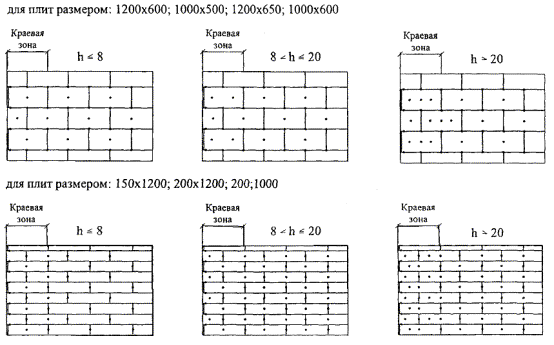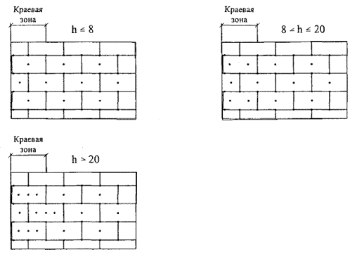 1. Количество дюбелей, устанавливаемых на 1 м2 системы, зависит от размеров плиты утеплителя и допустимой нагрузки на дюбель + высоты (h). 2. Границы краевой зоны расположены на расстоянии 1 м ≤ а/8 ≤ 2 м, где а - ширина торца здания.