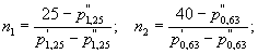 где n1, n2 - содержание песка из отсевов дробления в смеси с природным, доли единицы, на сите с размером ячейки 1,25 и 0,63 мм соответственно;