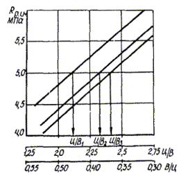 Примечания: 1. Бетонные смеси содержат комплексную добавку ЛСТ + СВП в количестве 0,3 + 0,02 % массы цемента. 2. Бетонные смеси указанных составов характеризуются жесткостью 10 - 15 с (по техническому вискозиметру) и содержанием вовлеченного воздуха 5 - 6 % через 30 мин после окончания перемешивания. х) Щебень отдельных фракций 5 (10) - 20 мм или 20 - 40 мм либо смесь 5 (10) - 20 мм и 20 - 40 мм в зависимости от наличия материалов и возможности дозирования. Рис. 2. Зависимость прочности Rр.и бетона от Ц/В при различном расходе крупного заполнителя 4.20. Ориентировочные составы бетона (при использовании портландцемента марки 500 и фактической активностью при изгибе 6,5 - 7,0 МПа, среднего кварцево-полевошпатового природного песка с модулем крупности 2,2, песка из отсевов дробления с модулем крупности 3,2) приведены в табл. 3. 5. Особенности технологии производства и контроля качества работ5.1. Приготовление бетонной смеси следует осуществлять в бетоносмесительных установках цикличного или непрерывного действия, обеспечивающих получение смеси, удовлетворяющей требованиям ГОСТ 26633-85. 5.2. Бетоносмесительные установки должны быть оснащены бункерами-дозаторами по числу отдельно дозируемых заполнителей: природного песка, песка из отсевов дробления и щебня. В случае использования щебня двух фракций, дозируемых раздельно, необходимо предусмотреть четвертый расходный бункер с дозирующим устройством для дозирования песка из отсевов. 5.3. Бункеры-дозаторы в смесительных установках непрерывного действия должны быть оснащены дозаторами с производительностью, обеспечивающей истечение требуемого количества каждого материала из одного отдельного бункера. 5.4. Для обеспечения требуемого объема вовлеченного воздуха в бетонной смеси следует руководствоваться «Методическими рекомендациями по обеспечению воздухововлечения в бетонную смесь при строительстве цементобетонных покрытий автомобильных дорог и аэродромов» (Союздорнии. М., 1983). 5.5. При приготовлении бетонных смесей в смесительных установках, в которых дозирование осуществляется на ленту сборного транспортера, следует установить такую последовательность дозирования: песок из отсевов дробления, природный песок и щебень. 5.6. При укладке бетонной смеси в покрытие комплектом машин со скользящими формами скорость бетонирования не должна превышать 2 м/мин. 5.7. Перед началом работ проводят пробное бетонирование в соответствии с рекомендациями «Руководства по организации и технологии строительства аэродромных цементобетонных покрытий» (Союздорнии, М., 1982). В процессе пробного бетонирования дополнительно визуально оценивают качество удобообрабатываемости (отделываемости) бетонной смеси. Если удобообрабатываемость бетонной смеси окажется неудовлетворительной, то следует произвести корректировку состава бетона в соответствии с п. 4.19. 5.8. Рекомендуется контролировать модуль крупности природного песка и песка из отсевов, регулируя при необходимости соотношение между ними с целью обеспечения постоянства модуля крупности смешанного песка. 5.9. При пробном бетонировании, а также в процессе производства работ рекомендуется определять зерновой состав заполнителя путем мокрого рассева в целях контроля фактического содержания в смеси песка из отсевов дробления и природного, а также щебня. Для контроля соотношения ме