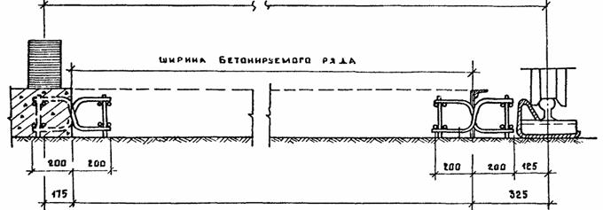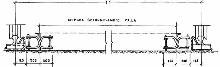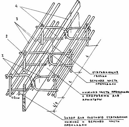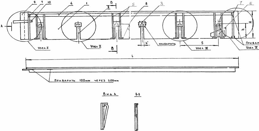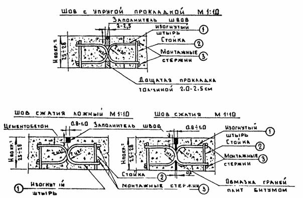 ПРИМЕЧАНИЯ: 1. Расстояние между парами изогнутых штырей (шаг штырей) - 0,5 м. 2. Длина усилительных стержней указана для плит размером 3,5×5,0 м (Нп = 16 ÷ 28 см) и 7,0×7,5 м (Нп = 30 ÷ 40 см). 4. КОНСТРУКЦИЯ МЕТАЛЛИЧЕСКОЙ СЪЕМНОЙ ОПАЛУБКИ4.1. Металлическая съемная опалубка (или дощатая) применяется для устройства соединений плит изогнутыми штырями в продольных технологических швах при бетонировании покрытий машинами типов ДС-110 (автогрейд), Д-376 (рельсовые) или вручную с использованием средств малой механизации. 4.2. Конструкция металлической опалубки (рис. П.3.1, Приложение 3) включает металлический лист 1 с вырезами 2 для размещения изогнутых штырей, имеющий в верхней часта ребро горизонтальной жесткости 4 и боковые скобы 5, служащие для размещения клиньев 6 под изогнутыми штырями. Металлическая опалубка членится на секции длиной, обеспечивающей удобства ручной переноски. Концы секций опалубки стыкуются и соединяются при помощи торцевых накладок 9 и скоб 7, приваренных к металлическому листу 1 путем закладки металлических стержней 10 между накладками 9 и двумя скобами 7 соединяемых секций. 4.3. Съемная металлическая опалубка изготовляется в количестве, достаточном для двухдневного бетонирования. 5. УСТАНОВКА КАРКАСОВ НА ОСНОВАНИЕ5.1. Каркасы с дощатой прокладкой доставляются к месту бетонирования в собранном виде. Установка металлической опалубки (в случае применения комплекта машин со скользящей опалубкой) производится на каркасы после их установки на подготовленное основание. 5.2. Разметка створов швов для установки каркасов в поперечных швах производится путем установки вешек с обоих сторон ряда бетонирования. 5.3. Разметка для установки каркасов в продольных швах производится в зависимости от типа применяемых бетоноукладочных машин: - для машин с рельс-формами - относительно рельс-форм или кромки ранее забетонированного ряда; - для машин со скользящей опалубкой - относительно копирной струны. Точки перекрещивания изогнутых штырей должны совпадать со створами швов. 5.4. Продольные и поперечные каркасы свариваются по углам плит монтажными стержнями (рис. П.1.1 - П.1.3, Приложение 1). 5.5. Металлическая опалубка перед бетонированием устанавливается на каркас таким образом, чтобы ребро жесткости находилось сбоку от бетонируемого ряда, а места перекрещивания изогнутых штырей разместились в вырезах. Опалубка крепится клиньями на каркасе путем установки клиньев снизу под местами перекрещивания штырей (сбоку вертикального листа, входящим.) в две скобы 5 вырезов 2. Клинья забиваются до обеспечения устойчивого положения листа на каркасе. 5.6. Установка и закрепление съемной металлической опалубки (или дощатых прокладок) на каркасах продольных (технологических) швов производится в одном уровне с бетонируемой поверхностью, а дощатых прокладок на поперечных швах расширения - на 3 - 4 см ниже бетонируемой поверхности. 5.7. Установка армосеток (при армобетонных покрытиях) производится путем укладки их на каркасы стыковых соединений (рис. П.1.2, Приложение 1) и соединение сваркой. 5.8. Установка армокаркасов (при железобетонных покрытиях) производится путем укладки их на основание согласно проекту и соединение с каркасами стыковых соединений монтажными стержнями (рис. П.1.3, Приложение 1). 5.9. В продольных птах каркасы устанавливаются вдоль рельс-форм без крепления к основ