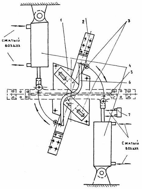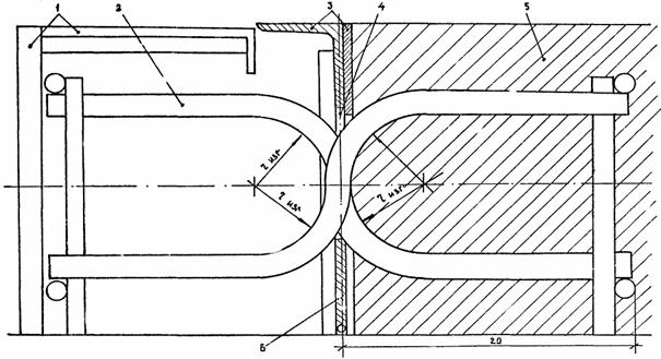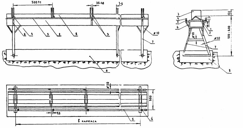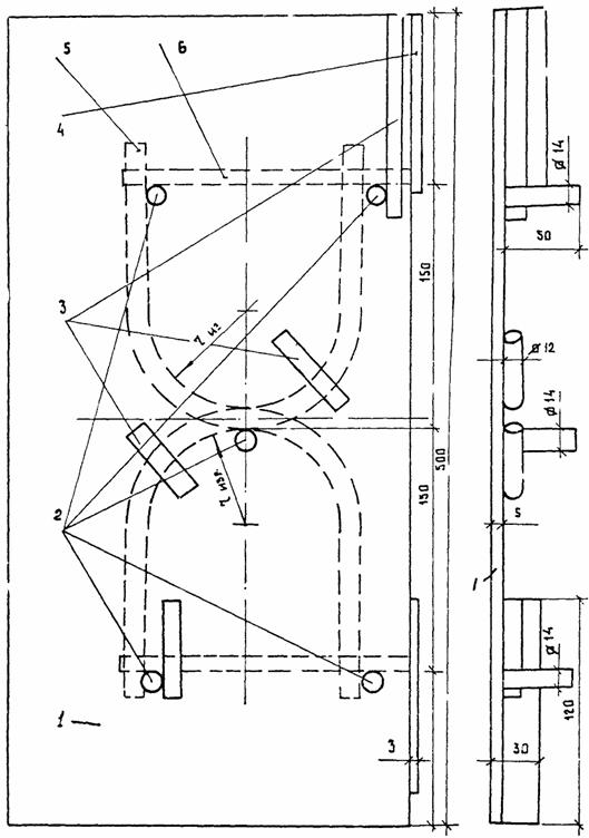 швов со стыковым соединением плит изогнутыми штырями Размеры даны в см Рис. П.1.5. ПРИЛОЖЕНИЕ 2СХЕМЫ ПРИСПОСОБЛЕНИЙ ДЛЯ ИЗГОТОВЛЕНИЯ КАРКАСОВ СТЫКОВЫХ СОЕДИНЕНИЙ ПЛИТ ИЗОГНУТЫМИ ШТЫРЯМИСхема гибочного станка для изготовления изогнутых соединительных штырей 1 - станина; 2 - поворотный рычаг; 3 - упоры фасонные (сменные); 4 - пневмоцилиндры; 5 - заготовка изогнутого штыря; 6 - изогнутый соединительный штырь; 7 - пневмоклапан. Рис. П.2.1. Шаблон-кондуктор для сваривания изогнутых соединительных штырей в пары 1 - основание; 2 - установочные (базовые) шпильки; 3 - подкладки; 4 - упоры; 5 - штыри; 6 - стойки. Размеры даны в мм Рис. П.2.2 Шаблон-кондуктор (пространственный) для сборки-сваривания каркасов стыковых соединений плит изогнутыми штырями (по авторскому свидетельству № 450865) 1. Швеллер № 18 - 20; 2. Уголок (установочный) 50×50 ÷ 10×10; 3. Пластины (установочные); 4. Упоры; 5. Стержень (поддерживающий); 6. Кронштейн; 7. Ножки; 8. Фундамент (бетонный). Размеры даны в мм Рис. П.2.3. ПРИЛОЖЕНИЕ 3СХЕМА СЪЕМНОЙ МЕТАЛЛИЧЕСКОЙ ОПАЛУБКИ
