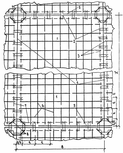 Пример расчета экономической эффективности применения соединений плит изогнутыми штырями при строительстве цементобетонных покрытий на одном из аэродромов Крайнего Севера дан в Приложении 4. ПРИЛОЖЕНИЕ 1СХЕМЫ РАСПОЛОЖЕНИЯ СТЫКОВЫХ СОЕДИНЕНИЙ В ПЛАНЕ ДЛЯ РАЗЛИЧНЫХ ТИПОВ ПОКРЫТИЙПлан цементобетонного покрытия со стыковым соединением плит изогнутыми штырями (для плит 5,0×3,5 м) Размеры даны в см Рис. П.1.1 Рис. П.1.2 План армобетонного покрытия со стыковым соединением плит изогнутыми штырями 1 - плита; 2 - изогнутые соединительные штыри; 3 - монтажные стержни (усилительная краевая арматура; 4 - шов сжатия; 5 - шов расширения; 6 - армосетка; 7 - каркасы соединения и усиления краев плит; 8 - монтажные стержни Рис. П.1.3 План монолитного железобетонного покрытия со стыковым соединением плит изогнутыми штырями 1, 2 - каркасы поперечных и продольных швов; 3 - швы сжатия; 4 - шов расширения; 5 - каркасы плит; 6 - монтажные стержни. Рис. П.1.4 Конструкция