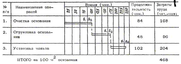 1. ОБЛАСТЬ И ЭФФЕКТИВНОСТЬ ПРИМЕНЕНИЯ КАРТЫ1.1. Карта предназначена для организации труда рабочих при подготовке основания для устройства полимерцементной стяжки. 1.2. Показатели производительности труда: выработка на 1 чел.-день, м2 - 102,7 затраты труда на 100 м2, чел.-ч. - 7,79 ПРИМЕЧАНИЕ: в затраты труда входит время на подготовительно-заключительные работы (4 %) и отдых (12 %). 2. УСЛОВИЯ И ПОДГОТОВКА ВЫПОЛНЕНИЯ ПРОЦЕССА2.1. До начала работ необходимо: закончить все строительно-монтажные, а также штукатурные, плиточные работы и устройство цементных стяжек; вынести отметки чистого пола. 2.2. Устройство стяжек допускается при температуре воздуха на уровне пола не ниже +5 °С. 2.3. При выполнении работ необходимо соблюдать требования СНиП III-В.14-72. «Полы. Правила производства и приемки работ», «Инструкции по устройству полов в жилых и общественных зданиях» (ВСН-35-80) и СНиП III-4-80 «Техника безопасности в строительстве». 3. ИСПОЛНИТЕЛИ, ПРЕДМЕТЫ И ОРУДИЯ ТРУДА3.1. Исполнители: бетонщик IV разряда (Б1) - 1 бетонщик III разряда (Б2) - 1 3.2. Инструменты, приспособления и инвентарь