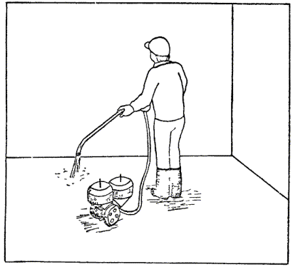 3.3. Расход материалов на 100 м2 основания: пластифицированная поливинилацетатная 50 %-я дисперсия - 4 кг 4. ТЕХНОЛОГИЯ ПРОЦЕССА И ОРГАНИЗАЦИЯ ТРУДА4.1. Подготовка основания под устройство полимерцементной стяжки выполняется в следующей последовательности: очистка основания; огрунтовка основания 5 %-й дисперсией ПВА состава 1:9 (дисперсия : вода); установка маяков: маяки устанавливают на уровне проектных отметок по маркам из раствора; первый ряд маяков устанавливается параллельно длинной стене на расстоянии от нее 0,5 - 0,6 м. Остальные ряды маяков располагают параллельно первому через 2 - 2,5 м. 4.2. Схема организации рабочего места