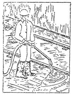 4. ТЕХНОЛОГИЯ ПРОЦЕССА И ОРГАНИЗАЦИЯ ТРУДА4.1. Устройство стяжки выполняют в следующей последовательности: 1) нанесение раствора; полимерцементный раствор поступает к месту укладки следующим образом: товарный цементно-песчаный раствор принимают в приемный бункер комплексной штукатурной установки КУШР-2,7, затем в бункер заливают 10 %-ю поливинилацетатную дисперсию в количестве 250 л на 1 м3 раствора; после тщательного перемешивания готовый раствор по шлангам подают к месту укладки, а затем через сопло наносят на основание; 2) разравнивание раствора; 3) заполнение борозд после снятия маяков; 4) очистка стяжки от наплывов раствора; 5) смачивание стяжки 5 %-й дисперсией ПВА; 6) затирка основания. 4.2. Схема организации рабочего места