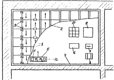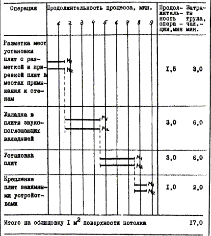 *) 103012, Москва, ул. Куйбышева, 3/8 3. Подготовка и условия выполнения процессаДо начала работ необходимо: выполнить электромонтажные и все отделочные работы, кроме завершающей окраски или оклейки стен обоями; смонтировать каркас подвесного потолка; установить передвижные вышки; доставить на рабочее место необходимое количество алюминиевых анодированных штампованных плит, звукопоглощающих вкладышей и пружинных зажимов, инструмент и приспособления. Качество используемых материалов, производство работ, обеспечение необходимых условий труда на рабочем месте должны соответствовать требованиям СНиП III-21-73, глава 21 «Отделочные покрытия строительных конструкций». Работы следует выполнять, соблюдая правила техники безопасности и охраны труда рабочих в соответствии со СНиП III-4-80 глава 4 «Техника безопасности в строительстве». Режим труда и отдыха принят из условия оптимального темпа выполнения трудовых процессов в соответствии с «Нормативами на подготовительно-заключительные работы и отдых при проектировании норм труда в строительстве» (ВНИПИ труда в строительстве Госстроя СССР, Москва, 1986). 4. Организация трудаСхема организации рабочего места приведена на рис. 1. Рис. 1. Схема организации рабочего места 1 - установленные плиты; 2 - металлический каркас; 3 - пружинный зажим для крепления плит; 4 - карниз; 5 - вышка передвижная; 6 - стол для подготовки плит к установке; 7 - пила дисковая электрическая; 8 - складирование алюминиевых плит; 9 - складирование звукопоглощающих вкладышей; 10 - ящик для инструмента; 11 - плиты, подготовленные для установки; 12 - ящик с пружинными зажимами; М1 и М2 - рабочие места монтажников конструкций. Стрелками показано направление ведения работ. Пооперационный график трудового процесса показан на рис. 2. Рис. 2. Пооперационный график трудового процесса Описание приёмов труда 1. Разметка мест установки плит с разметкой и прирезкой плит в местах примыкания к стенам Монтажники конструкций (М1 и М2), находясь на передвижных вышках, с помощью рулетки размечают места установки плит и наносят риски на направляющие профили каркаса. Затем М1 замеряет расстояние между крайним направляющим профилем и карнизом на стене, переносит эти размеры на плиты, а М2 дисковой пилой обрезает плиты соответственно сделанным замерам. После этого размечает плиты, в которых проектом предусмотрены отверстия для установки осветительной арматуры, вентиляционных решёток и т.п. М2 обрезает плиты по разметке. 2. Укладка в плиты звукопоглощающих вкладышей М2 берёт из штабеля алюминиевые плиты и размещает их на столе. М1 укладывает в них готовые звукопоглощающие вкладыши размером 600×600 мм, состоящие из минераловатных матов, обёрнутых в полиэтиленовую плёнку. Вкладыши для плит, примыкающих к стенам и имеющих отверстия, М1 размечает, а М2 обрезает дисковой пилой. Подготовленные плиты монтажники подносят к вышке и укладывают на настил. 3. Установка плит Установка алюминиевых плит осуществляется по алюминиевым направляющим профилям, расположенным параллельно друг другу с шагом равным ширине плиты. М1 и М2, находясь на передвижной вышке, берут с настила алюминиевые плиты со звукопоглощающими вкладышами и устанавливают их в пазы алюминиевых направляющих профилей в соответствии с нанесенными рисками. Плиты, примыкающие к стенам, монтажники укладывают одной 