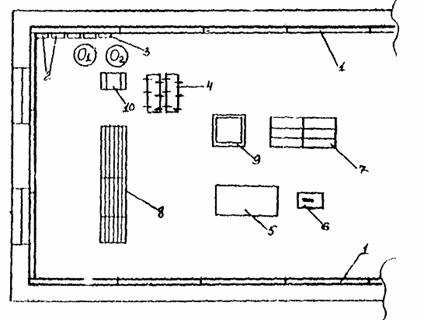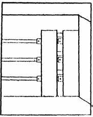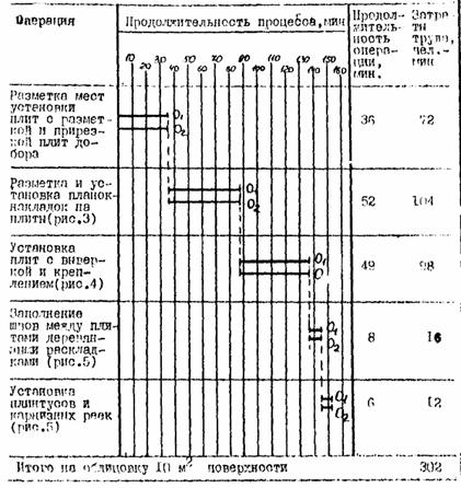 3. Подготовка и условия выполнения процесса.До начала работ необходимо: закончить все работы по отделке потолков и прокладке скрытых проводок, смонтировать деревянный каркас из горизонтальных брусков сечением 50×60 мм; доставить на рабочее место необходимые материалы и инструменты, приспособления и инвентарь; подобрать плиты по рисунку и оттенку. Качество используемых материалов, производство работ, обеспечение необходимых условий труда на рабочем месте должны соответствовать требованиям СНиП III-21-73, глава 21 «Отделочные покрытия строительных конструкций». Работы следует выполнять, соблюдая правила техники безопасности и охраны труда рабочих в соответствии со СНиП III-4-80, глава 4 «Техники безопасности в строительстве». Режим труда и отдыха определен из условия оптимального темпа выполнения трудовых процессов в соответствии с «Нормативами на подготовительно-заключительные работы и отдых при проектировании норм труда в строительстве» (ВНИПИ труда в строительстве Госстроя СССР, Москва, 1986). 4. Организация труда.Схема организации рабочего места приведена рис. 1. Рис. 1. Схема организации рабочего места 1 - деревянный каркас; 2 - установленные древесностружечные плиты; 3 - устанавливаемая древесностружечная плита; 4 - плиты, подготовленные для установки (с планками-накладками); 5 - стол-верстак; 6 - дисковая пила; 7 - складирование древесностружечных плит, покрытых пластиком; 8 - складирование карнизных реек, плинтусов и деревянных раскладок; 9 - ящик с планками-накладками, изготовленными из фанеры; 10 - ящик для инструментов и крепежных элементов (гвозди, шурупы); 01, 02 - рабочие места облицовщиков. Пооперационный график трудового процесса показан на рис. 2. Рис. 2. Пооперационный график трудового процесса Описание приемов труда 1. РАЗМЕТКА МЕСТ УСТАНОВКИ ПЛИТ С РАЗМЕТКОЙ И ПРИРЕЗКОЙ ПЛИТ ДОБОРА. Облицовщики (01 и 02) начинают разметку от угла помещения или контура проема: с помощью рулетки определяют число целых плит и плит добора, зятем намечают расположение целых плит с симметричным размещением доборов, нанося риски на деревянные бруски каркаса. После этого 01 делает замеры, определяет размеры доборов и переносит их на плиты. 02 дисковой пилой обрезает плиты в соответствии с разметкой и зачищает кромки рубанком. 2. РАЗМЕТКА И УСТАНОВКА ПЛАНОК-НАКЛАДОК НА ПЛИТЫ. 01 укладывает плиту на верстак и с помощью угольника по вертикальным граням тыльной стороны плиты размечает места установки планок-накладок из фанеры: по одной грани - в соответствии с уровнем брусков каркаса, по другой - выше на 1 см верхней грани брусков. 02 в соответствии с разметкой шуруповертом крепит планки-накладки к плите самонарезающими шурупами так, чтобы планки наполовину выступали за контур плиты (см. рис. 3). На угловых плитах накладки по одной и другой граням крепятся в одном уровне с брусками каркаса. 3. УСТАНОВКА ПЛИТ С ВЫВЕРКОЙ И КРЕПЛЕНИЕМ. Первую плиту 01 и 02 устанавливают на каркас в соответствии с разметкой, затем 02 прижимает плиту к каркасу, а 01 крепит ее с одной стороны гвоздями по планкам-накладкам и брускам каркаса. После этого 02 по отвесу проверяет правильность установки плиты, и 01 окончательно закрепляет плиту, прибивая планки-накладки на другой стороне плиты к каркасу. Последующие плиты монтируют таким образом: 02 заводит планки-накладки, расположенные на грани плит