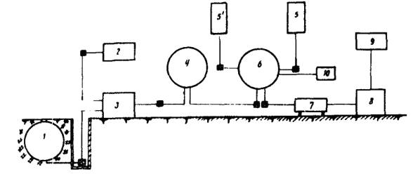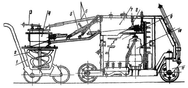 В данном случае для приготовления резинобитумной мастики с температурой размягчения 80 °С необходимо взять 12 % резиновой крошки или 136,3 кг на 1000 кг битума. Приготавливают мастику РБВ найденного состава. Определяют температуру размягчения и в случае несоответствия повторяют подбор. Окончательный состав резинобитумной мастики устанавливают после ее проверки на все показатели по методике, изложенной в приложении 1 настоящих «Методических рекомендаций». ПРИЛОЖЕНИЕ 3Оборудование для заполнения швов тиоколовыми герметикамиДля приготовления тиоколовых герметиков и заполнения деформационных швов применяют специальный комплект оборудования, включающий смесительный агрегат (миксер); заливщики швов (2 шт.); приспособления для подготовки швов к заполнению. Смесительный агрегат (рис. 1) имеет двигатель, компрессор и гребенку, смонтированные на сварной раме трехколесной тележки и защищенные каркасом с легкосъемным капотом. Смесительный агрегат может в течение 5 - 7 мин перемешать 45 - 50 кг тиоколового герметика трехзаходным шнековым смесителем, расположение лопастей которого позволяет получить однородную массу при постоянной скорости перемешивания. Смеситель приводится в действие двигателем внутреннего сгорания через клиноременную, карданную и редукторную систему передач. Шарнирная рама с консольной подвеской, закрепленной на каркасе смесительного агрегата, допускает вертикальное перемещение редуктора со шнеком. Для предотвращения выплескивания перемешиваемой массы через край заливщика в процессе работы смесителя между корпусом редуктора и смесителем установлен фланец. Положение фланца фиксируют двумя штырями и окончательно закрепляют винтами-барашками. Обрезиненные колеса на подшипниках качения позволяют перемещать смесительный агрегат по покрытию усилием одного человека. Рис. 1. Смесительный агрегат 1 - емкость заливщика швов; 2 - шнековый смеситель; 3 - рычаг включений шнека; 4 - редуктор; 5 - винтовая тяга подъема-опускания смесителя; 6 - шарнирная рама консольной подвески смесителя; 7 - бак для горючего; 8 - карданный привод смесителя; 9 - двигатель внутреннего сгорания; 10 - компрессор; 11 - трехколесная тележка смесительного агрегата Техническая характеристика смесительного агрегата Тип агрегата......................................................... Передвижной Перемешивающее устройство............................ Лопастно-шнековое Число оборотов.................................................... 35 об/мин Редуктор................................................................ Червячный с передаточным числом 28 Мощность двигателя УД25................................. 8 л.с. Число оборотов.................................................... 3000 об/мин Компрессор.......................................................... 0,39 А Производительность........................................... 15 м3/ч Максимальное давление воздуха....................... 7 ати Число оборотов.................................................... 800 об/мин Ресивер................................................................. 15 л Число выходных штуцеров................................. 3 Ходовая часть агрегата........................................ Трехколесная тележка Размеры (длина, ширина, высота)..................... 2420´1000´1260 мм Масса.................................................................... 451 кг 2. Заливщик швов (рис. 2) представляет собой трехколесную тележку с шарнирно закрепленной на ней емкостью, которая выполнена в виде усеченного конуса и крепится к раме на двухповоротных цапфах. Герметизацию емкости заливщика обеспечивает специальн