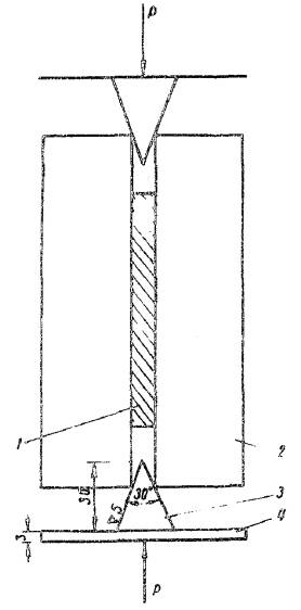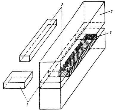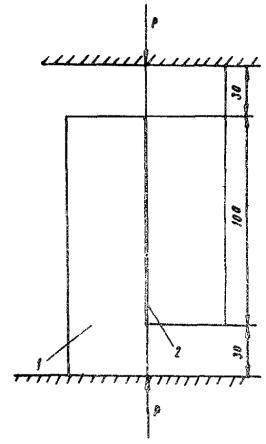 где σсж - прочность при сжатии образцов-швов, испытываемых на гидравлическом прессе, кгс/см2; σр - прочность при растяжении образцов-швов, испытываемых на разрывной машине ЦДМК-30. Разрушение образцов-швов обозначают: К - разрушение по герметизирующему материалу; А - разрушение по контактному слою; КА - разрушение и по герметизирующему материалу, и по контактному слою; б) относительное удлинение εр при растяжении в момент разрыва определяют по следующей формуле: где lp - ширина расчетного участка образца-шва в момент разрыва, мм; l0 - ширина расчетного участка образца-шва перед растяжением, мм. 2. Определение сцепления герметизирующих материалов с бетоном Сцепление герметизирующих материалов с бетоном определяют на гидравлическом прессе. Для этого торцы бетонных балочек (40´40´160 мм) грунтуют (если это требуется по технологии), а затем склеивают герметиком слоем не более 0,5 мм. Для испытания изготавливают не менее шести образцов, которые выдерживают в соответствии с п. 1. Образец устанавливают в центре плиты гидравлического пресса так, чтобы сжимающая сила проходила по склеивающему слою. Верхняя плита должна слегка касаться торца бетонной балочки (рис. 3). Рис. 3. Схема для определения сцепления герметизирующих материалов с бетоном: 1 - бетонная балочка 40´40´160 мм; 2 - мастика 0,5´20´100 мм После проверки нулевых установок измерительных приборов включают гидравлический пресс и разрушают образец-шов по контактному слою - «герметизирующий материал - бетон». Затем фиксируют разрушающую нагрузку. Сцепление герметизирующего материала с бетоном (адгезию) вычисляют по формуле
