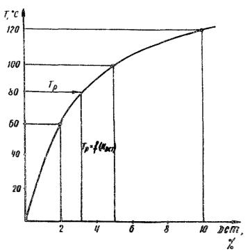 где С0 - масса сухого образца, г; С1 - масса образца после пребывания в воде, г. Водопоглощение для образцов-«близнецов» подсчитывают как среднеарифметическое водопоглощение всех трех образцов. Значения водопоглощения различных герметизирующих материалов обычно колеблются в пределах 1 - 5 %. 6. Определение температуры хрупкости Температура хрупкости характеризует переход мастики из упругоэластичного состояния в хрупкое и определяет одну из температурных границ испытуемого материала. Для испытания изготавливают образец 0,4´20´60 мм. Затем опускают в стеклянный или металлический стакан с глицерином, обложенный льдом. С понижением температуры через каждые 5 °С при положительных температурах и через каждые 3 °С при отрицательных образец извлекают на 5 с и изгибают его по полуокружности стержня диаметром 20 мм. Скорость понижения температуры глицерина должна быть 1 °С за 2 мин. За температуру хрупкости трех образцов принимают среднеарифметическое двух результатов, разность между которыми составляет не более 2 °С. Температуру, при которой появляется первый излом на образце, считают температурой хрупкости мастики. 7. Определение жизнеспособности герметиков холодного приготовления Жизнеспособность герметиков - это время от начала перемешивания герметизирующей пасты с отвердителем до момента, когда смесь становится непригодной к применению в нормальных климатических условиях. В чистой сухой посуде перемешивают составляющие герметика в течение 3 - 5 мин до получения однородной по свету массы. Готовую смесь массой 50 г наносят на стеклянную пластину (80´80´0,2 мм) в виде лепешки диаметром 60 - 70 мм. Для исключения прилипания стеклянную пластину смазывают вазелином. Испытания проводят при температуре окружающего воздуха, но не ниже + 5 °С. За 30 мин до истечения указанного заводом-изготовителем срока жизнеспособности герметика необходимо максимально на 1 с прикоснуться к нему стеклянной палочкой с оплавленными концами диаметром 6 мм и длиной 10 см, с силой ее собственной массы, Это прикосновение повторяют через каждые 5 мин. Если при поднятии стеклянной палочки герметик не тянется за ней и не оставляет на ней следов, значит жизнеспособность герметика истекла. Время от начала смешения составляющих до последнего прикосновения палочкой к герметику, при котором он не прилипает, принимается за время жизнеспособности герметика. ПРИЛОЖЕНИЕ 2Методика подбора состава мастики1. Состав полимерно-битумной мастики, приготавливаемой в условиях строительного объекта, подбирают следующим образом: обезвоживают битумы и доводят их до рабочей температуры; приготавливают 15 %-ный раствор ДСТ в растворителе; рассчитывают необходимое весовое количество ДСТ при его содержании 2; 5 и 10 % от массы битума; приготавливают три пробы мастики ПБМ с содержанием ДСТ 2; 5 и 10 % от массы битума; определяют температуру размягчения по методу «Кольцо и шар» для каждой полученной пробы мастики: строят график зависимости температуры размягчения от содержания ДСТ (рис. 1); Рис. 1. График для определения оптимального значения ДСТ: Тр - требуемая температура размягчения данного объекта, °С; Кдст - концентрация ДСТ, % определяют требуемое содержание ДСТ для приготовления мастики с заранее заданной температурой размягчения по графику