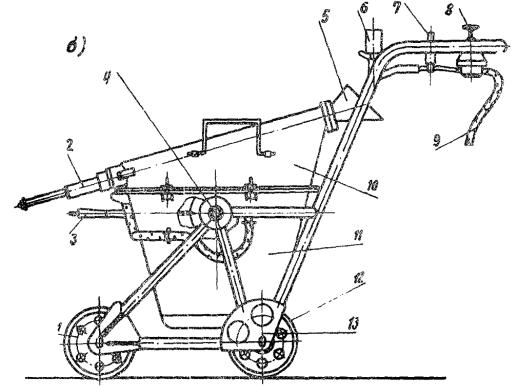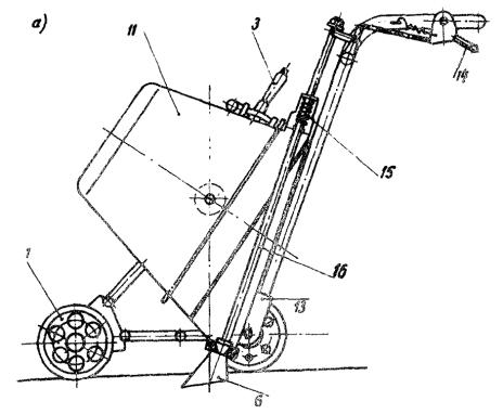 Рис. 2. Заливщик швов: 1 - переднее ребордное направляющее колесо; 2 - шток выпускного клапана; 3 - рычаг поворота емкости; 4 - ось поворота емкости с транспортного положения в рабочее; 5 - сменное сопло; 6 - манометр; 7 - воздушный кран; 8 - редукционный клапан; 9 - шланг для подачи сжатого воздуха от компрессора смесительного агрегата; 10 - крышка; 11 - емкость заливщика; 12 - задние несущие колеса; 13 - трехколесная тележка; 14 - рычаг регулировки открытия клапана; 15 - пружина клапана; 16 - тяга выпускного клапана б) начальное или транспортное (рис. 2, б), соответствующее введению в него компонентов герметика и перемешиванию их до получения однородной массы. В этом положении уплотнительная крышка снята, а ось емкости занимает вертикальное положение. Техническая характеристика заливщика швов Емкость бака................................................ 45 л Давление сжатого воздуха при подаче мастики в шов................................ 0,5 - 2,5 ати Регулирование подачи мастики................ Коническим клапаном на выпускном отверстии и изменением давления воздуха Внутренний диаметр шланга, подводящего воздух от компрессора на агрегате к заливщику............................. 9 мм Скорость заливки........................................ 6 м/мин Количество колес....................................... 3 Переднее колесо.......................................... Металлическое с центральной ребордой Задние колеса.............................................. Обрезиненные Габариты (длина, ширина, высота).......... 1340´694´990 мм Масса........................................................... 142 кг 3. Комплект приспособлений для подготовки швов к заполнению включает: а) приспособление для очистки швов от щебня, песка и грунта, выполненное в виде стального крюка, отогнутого книзу. При перемещении рабочего органа вдоль шва одновременно в шов подается сжатый воздух, подведенный от компрессора смесительного агрегата к полой рукоятке приспособления. Такая комбинированная очистка шва (одновременно механическая и пневматическая) эффективна и проста; б) приспособление для очистки швов от песка и пыли, выполненное в виде вращающейся щетки с металлическим ворсом и полой рукоятки для сжатого воздуха, подводимого от компрессора. Щетка вращается от ходового колеса через функциональную передачу; в) приспособление для просушки влажной поверхности швов, выполненное в виде паяльной лампы, смонтированной на трехколесной тележке; г) приспособление для предохранения подготовленных к заполнению герметиком швов от повторного загрязнения и заполненных швов - от попадания влаги, выполненное в виде катушки с бумажным рулоном с войлочными и резиновыми роликами и бачка с клеем. Ширина наклеиваемой ленты 40 мм. Примечания: Чтобы избежать налипания тиоколового герметика на металлические поверхности оборудования внутренние стенки заливщика швов и лопасть смесительного агрегата за 15 - 20 мин до начала приготовления герметика следует смазывать 5 %-ным раствором полиизобутилена в бензине. 2. Качественное заполнение швов постигается при установившемся давлении в емкости заливщика и правильно выбранном в зависимости от ширины заполняемого шва типе сопла. 3. По окончании рабочей смены все внутренние поверхности заливщика швов, сопла и лопасти смесителя должны быть тщательно очищены от остатков герметика скребком. СОДЕРЖАНИЕ