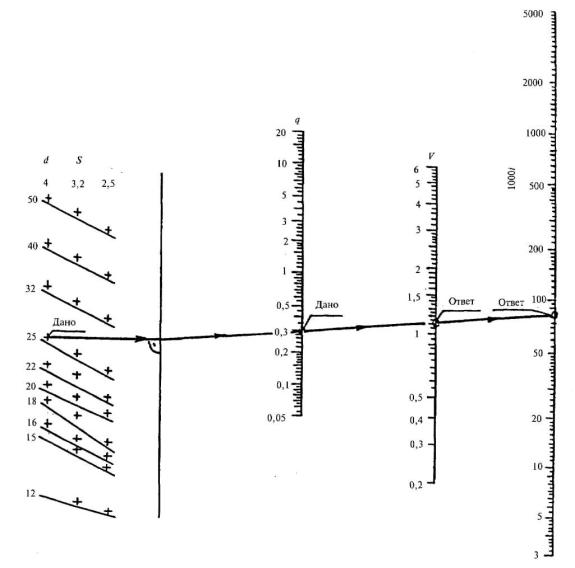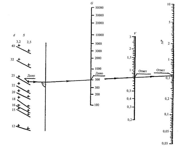 d - наружный диаметр, мм; S - серия труб; G - расход теплоносителя, кг/ч; V - средняя по сечению скорость движения теплоносителя, м/с; DР - разность давлений, кПа/м