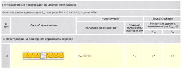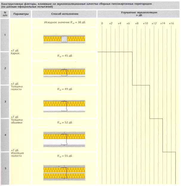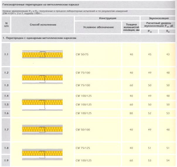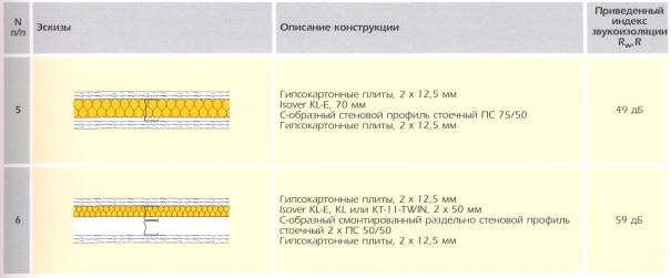 б) Стены и перегородки в жилых зданиях, учебных заведениях, больницах, гостиницах, санаторияхНормативные требования к звукоизоляции внутренних ограждающих конструкций в перечисленных выше зданиях изложены в табл. 4. В жилых зданиях и в зданиях гостиниц они зависят от категории, установленной для данного объекта. Приведенный индекс звукоизоляции воздушного шума Rw для категории А должен быть на 3 - 4 дБ выше, чем для категорий Б и В. Для несущих внутренних стен, выполненных из бетона или кирпича, требования к их звукоизоляции выполняются почти всегда автоматически, т.к. их толщина рассчитывается из условий нагрузки на стену. Внутренние ненесущие перегородки между квартирами, комнатами и др. помещениями выполняются чаще всего в облегченных вариантах, поэтому здесь основным предъявляемым к ним требованием является необходимая изоляция воздушного шума. Легкие перегородки применяют также при строительстве офисных, административных зданий, гостиниц, общежитий. Легкие перегородки Легкие перегородки представляют собой слоистую конструкцию, состоящую из двух плотных слоев, между которыми есть воздушный промежуток, заполненный минерало- или стекловолокном. Звукоизоляция воздушного шума перегородки зависит от толщины и массы наружных слоев перегородки и от величины и материала заполнения внутреннего пространства между наружными слоями волокнистым материалом. Очень большое влияние на звукоизоляцию перегородки оказывают стыки между нею и перекрытиями и примыкающими к ней с торцов стенами или другими перегородками. На рис. 4 приведены эскизы, описание и величины Rw для легких перегородок каркасной конструкции с использованием гипсокартонных плит толщиной 12,5 мм и заполнителя из плит Isover KL-E, KL, KT-11 разной толщины. Рис. 4