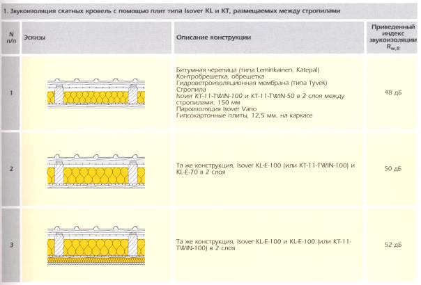 Примечание: К гостиницам категории А относятся гостиницы, имеющие по международной классификации четыре и пять звезд, к категории Б - три звезды, к категории В - менее трех звезд. 5. Расчет и проектирование средств защиты от шумаПри проектировании защиты от шума для обеспечения предельно допустимых уровней звукового давления и уровней звука в помещениях должны соблюдаться основные требования, изложенные в СНиП II-12-77 «Защита от шума», утвержденные ГОССТРОЕМ СССР. Защиту от шума следует проектировать на основании акустического расчета и предусматривать для снижения уровня шума: - необходимую звукоизоляцию ограждающих конструкций от воздушного и ударного шума, звукоизоляцию мест пересечения ограждающих конструкций с инженерными коммуникациями, устройство звукоизолирующих кабин наблюдения, выгородок, укрытий, кожухов, уплотнение притворов окон, дверей, ворот; - применение звукопоглощающих облицовок и экранов; - применение глушителей шума систем вентиляции и кондиционирования воздуха. При проектировании перечисленных средств защиты от шума применимы материалы, выпускаемые компанией Saint-Gobain Isover. Защита от шума с помощью минераловатных изоляционных материалов Целью мер по защите от шума в зданиях является уменьшение воздействия шума, исходящего снаружи или из соседних помещений. Наиболее эффективным является снижение шума в источнике его возникновения. Если это невозможно, то необходимо применить строительно-архитектурные решения для снижения шума до нормативных требований. К ним относится устройство звукоизолирующих стен и перегородок внутри здания, а также перекрытий, препятствующих распространению воздушного и ударного шума в соседние жилые и др. помещения, где требуется соблюдение предельно-допустимых уровней шума. В жилых и общественных зданиях находится много бытовых источников шума, а также инженерное оборудование зданий (вентиляционные системы, водопровод, лифты и т.п.) и оборудование встроенных (или пристроенных) котельных, магазинов, гаражей и прочее. Работа инженерного оборудования также сопровождается шумом. В помещениях, где находятся один или несколько источников шума, шум можно снизить, увеличив звукопоглощение потолка и стен, снизив этим интенсивность отраженного звука. 6. Защита от шума в жилищном строительствеа) Увеличение звукоизоляции кровельВ настоящее время в Москве и др. городах России довольно часто производят надстройку уже существующих зданий мансардами, где наружными стенами помещений являются скатные кровли зданий. Помещения внутри мансард могут быть жилыми или офисными. Поэтому к ним предъявляются те же требования по нормированию шума, что и к помещениям в обычных зданиях. Те же требования могут быть и к крышам зданий, расположенных в зонах пролета самолетов. Звукоизоляцию скатной кровли возможно повысить несколькими способами: