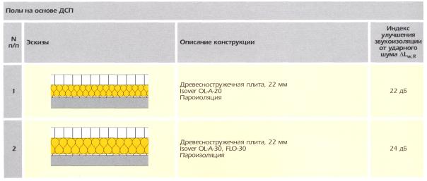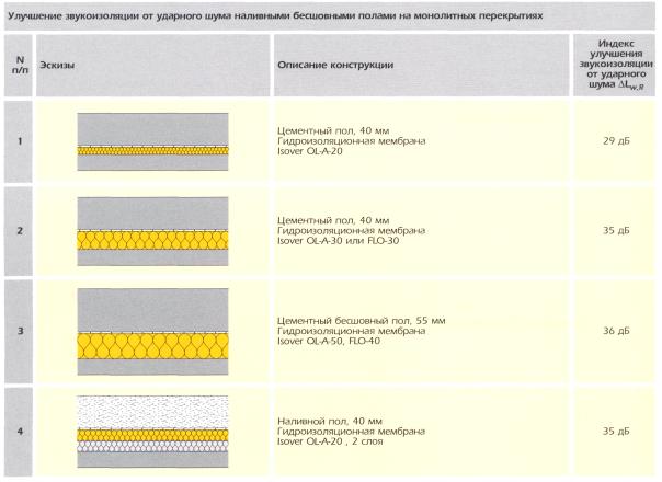 Компания Saint-Gobain Isover производит теплоизоляционные плиты, которые возможно применить в конструкциях междуэтажных перекрытий для улучшения их звукоизоляции от ударного шума (Isover OL-FLO) и от воздушного шума при устройстве подвесных потолков (ЕСОРН-ON), а также в качестве звукопоглощающих облицовок потолков. Плиты Isover FLO - жесткие стекло-волокнистые плиты, покрытые с двух сторон тонкой стеклотканью, применяются в конструкциях перекрытий для снижения ударного шума и обладают хорошими теплоизолирующими качествами. На рис. 5 - 6 приведены эскизы, описание и величины Lw для наливных полов разной конструкции. Рис. 5 Рис. 6