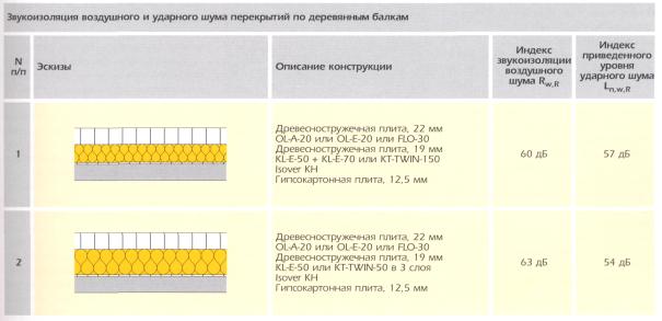 В настоящее время в массовом строительстве не применяют перекрытия из деревянных балок. Но при ремонте и реконструкции старых зданий, а также в индивидуальном строительстве могут применяться перекрытия по деревянным балкам, к которым предъявляются те же требования по звукоизоляции от ударного и воздушного шума, что и к перекрытиям по железобетонным плитам или из монолитного железобетона. Защита от ударного шума перекрытиями по деревянным балкам обеспечивается устройством плавающего сухого бесшовного пола и эластично (с помощью упругого подвеса) укрепляемого по низу балок подвесного потолка. Максимальную защиту от ударного шума можно обеспечить устройством плавающих наливных бесшовных полов из раствора с помощью материалов Isover FLO и OL-A. Защита от воздушного шума перекрытиями по деревянным балкам в большой степени зависит от передачи звука боковыми стенами. Ее можно уменьшить, установив дополнительные слои из сухой штукатурки или др. материалов на боковых стенах. На рис. 4 (стр. 21) приведены 2 варианта перекрытий по деревянным балкам. Рис. 4