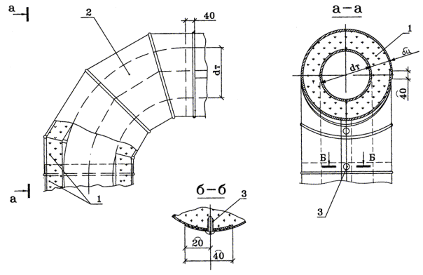 1 - цилиндры марок «ISOTEC KK-ALC», «ISOTEC KK-AL» 2 - защитное покрытие 3 - винт самонарезающий Рис. 4. Конструкция отвода трубопровода из цилиндров марок «ISOTEC KK-ALC», «ISOTEC KK-AL» с покрытием металлическим отводом