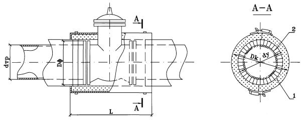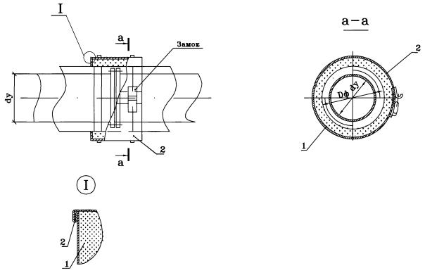 1 - цилиндры марок «ISOTEC KK-ALC», «ISOTEC KK-AL» 2 - отвод металлический 3 - винт самонарезающий Цилиндры закрепляются двумя бандажами с пряжками. Сверху устанавливается съемный кожух. Крепление цилиндров может осуществляться бандажами с пряжками или замками (рис. 5). Замки могут быть установлены непосредственно на кожухе (рис. 6). Торцы изоляции трубопроводов у фланцевых соединений и арматуры закрываются диафрагмами из материала защитного покрытия. При изоляции муфтовой и приварной арматуры цилиндры устанавливаются встык с изоляцией трубопровода под общим покрытием (кожухом). 4.1.10. Цилиндры могут использоваться в качестве теплоизоляционного вкладыша в составе полносборных или комплектных конструкций для изоляции трубопроводов и изготавливаются по ТУ 36-1180-85 «Индустриальные конструкции для промышленной тепловой изоляции трубопроводов, аппаратов и резервуаров» (рис. 7). В составе полносборной конструкции цилиндры должны быть соединены с защитным покрытием шплинтами (при металлическом защитном покрытии) или с помощью клеевого соединения (рис. 8). Теплоизоляционная полносборная конструкция оснащается бандажами. Возможно применение винтового крепления. В составе комплектной конструкции вкладыш и цилиндры с защитным покрытием не соединяется. 4.1.11. Цилиндры можно использовать в качестве вкладыша в полносборную конструкцию для изоляции фланцевого соединения или арматуры. При необходимости цилиндр режется пополам и скрепляется с покрытием шплинтами или с помощью клея. При этом длина полносборной конструкции должна быть равна длине фланцевого соединения или арматуры, включая присоединительные фланцы, плюс две длины болта, соединяющего фланцевый разъем, плюс 200 мм для установки на изоляцию трубопровода. 4.1.12. На вертикальных участках трубопроводов при изоляции цилиндрами рекомендуется устанавливать разгружающие опорные полки с шагом 3,6 м по высоте. 4.2. Конструкции тепловой изоляции на основе матов марки «ISOTEC KIM-AL» для трубопроводов и арматуры4.2.1. Маты марки «ISOTEC KIM-AL» с облицовкой армированной алюминиевой фольгой рекомендуется применять для изоляции трубопроводов наружным диаметром от 57 - 4000 мм с учетом данных таблицы 4 при температуре изолируемого трубопровода от минус 60 до 200 °С. Маты могут применяться для изоляции: - трубопроводов горячего и холодного водоснабжения в жилищном и гражданском строительстве, а также на промышленных предприятиях; - технологических трубопроводов с положительными и отрицательными температурами промышленных предприятий; - трубопроводов тепловых сетей при надземной (на открытом воздухе, в подвалах, помещениях) и подземной (в каналах, тоннелях) прокладках; - приварной и муфтовой арматуры при изоляции трубопроводов с холодной водой и с отрицательными температурами, если нет необходимости в применении съемной конструкции; - воздуховодов приточной вентиляции круглого и прямоугольного сечения. Предпочтительным является применение матов в конструкциях тепловой изоляции трубопроводов холодной воды и с отрицательными температурами и для изоляции воздуховодов приточной вентиляции, если не требуется установки покровного слоя. Рис. 5. Изоляция фланцевой арматуры диаметром до 140 мм включительно цилиндрами марок «ISOTEC KK-ALC», «ISOTEC KK-AL» со съемным металлическим кожухом 1 - цилиндры марок «ISOTEC KK-ALC», «ISOTEC KK-AL» 2 - 