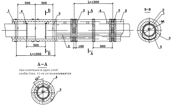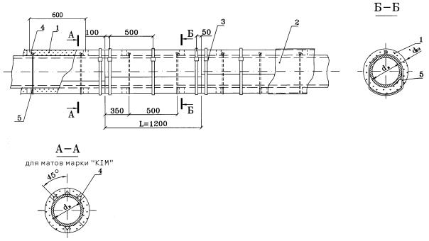 1 - цилиндры «ISOTEC KK-ALC» 2 - покрытие 3 - бандаж с пряжкой 4 - заклепка 5 - клеевое соединение dвн - внутренний диаметр конструкции dк - наружный диаметр конструкции Lк и Lц - длина конструкции и цилиндра 4.2.2. В теплоизоляционных конструкциях трубопроводов с теплоизоляционным слоем из матов марки «ISOTEC KIM-AL» крепление матов на трубопроводах наружным диаметром до 140 мм включительно производится клейкой алюминиевой лентой шириной 50 мм. Дополнительно следует стянуть конструкцию двумя бандажами из той же ленты шириной 30 мм (аналогично рис. 1). 4.2.3. Для крепления тепловой изоляции из матов марки «ISOTEC KIM-AL» в один слой для трубопроводов наружным диаметром 140 - 273 мм, кроме проклейки швов, устанавливают три бандажа на мат шириной 1200 мм. Бандажи изготавливают из алюминиевой ленты толщиной 0,5 - 0,8 мм. Ширина бандажа 20 - 40 мм. Отступ от края мата 100 мм. Расстояние между бандажами 500 мм (рис. 9, 10). Для предотвращения повреждения покрытия из алюминиевой фольги металлическими бандажами при изоляции трубопроводов холодной воды и с отрицательными температурами под бандажи рекомендуется устанавливать подкладки из стеклопластика рулонного. В качестве прокладки также может быть использована клейкая алюминиевая лента. При применении бандажей из неметаллических материалов (стеклопластика, фольгостеклоткани, полиэтиленовых или поливинилхлоридных лент, киперной ленты и др.) подкладки не устанавливаются. При изоляции трубопроводов холодной воды и с отрицательными температурами следует учитывать рекомендации п. 4.1.3. 4.2.4. При изоляции трубопроводов диаметром более 273 мм крепление матов в один слой осуществляется бандажами и подвесками. Бандажи устанавливаются с отступлением 100 мм от края мата и посередине. Подвески устанавливаются между бандажами посередине. Места проколов должны быть проклеены клейкой алюминиевой лентой. При изоляции в два слоя для крепления внутреннего слоя вместо бандажей можно применить проволочные кольца. При изоляции трубопроводов холодной воды и с отрицательными температурами в этом случае предусматривается дополнительный пароизоляционный слой и покровный слой. При толщине изоляции из матов марки «ISOTEC KIM-AL» в 20 и 30 мм подвески можно не устанавливать. При расположении изолируемых трубопроводов на открытом воздухе при изоляции матами марки «ISOTEC KIM-AL» следует учитывать требования п. 4.1.4. 4.2.5. Воздуховоды круглого сечения при применении матов марки «ISOTEC KIM-AL» изолируются так же, как трубопроводы. При изоляции воздуховодов прямоугольного сечения небольших размеров крепление матов производится бандажами из алюминиевой ленты через прокладки или проволокой. На сгибах под бандажи сверху прокладки могут быть установлены накладки из алюминиевого листа для сохранения формы конструкции и предотвращения повреждения фольги на углах конструкции (рис. 12). Маты должны плотно прилегать к поверхности воздуховода. Для предупреждения провисания матов снизу воздуховода рекомендуется применять дополнительные планки, струны или другие конструктивные решения, включая применение крепления штырями, с последующей заделкой мест проколов фольгированного покрытия. 4.2.6. При применении металлического покровного слоя при изоляции трубопроводов с отрицательными температурами матами марки «ISOTEC KIM-AL» без дополнительного пароизоляционного слоя под защи