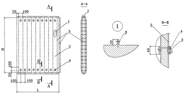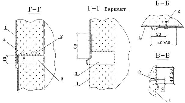 1 - металлическое покрытие 2 - опорное кольцо (для матов марки «KIM») 3 - винт самонарезающий Примечание. При изоляции плитами марки «KLS-K» и матами марки «KVM-50» опорное кольцо (поз. 2) устанавливать только у днищ и фланцевых соединений аппаратов. 4.11. Конструкция защитного покрытия вертикального аппарата (рис. 23, 24)4.11.1. Для вертикальных аппаратов, как и для горизонтальных, применяются металлические защитные покрытия из материалов, указанных в п. 4.10. Крепление защитного покрытия вертикальных аппаратов также осуществляется самонарезающими винтами 4´12 с антикоррозионным покрытием или заклепками. Шаг установки винтов (заклепок): по вертикали - 150 - 200 мм, по горизонтали - не более 300 мм. 4.11.2. В защитном покрытии аппарата по высоте должны быть предусмотрены температурные швы, в которых элементы защитного покрытия опираются на разгружающие устройства или кляммеры и не крепятся по горизонтали (окружности) (разрез Г-Г, рис. 24). Кляммеры могут быть установлены и на листы покрытия предыдущего ряда. По высоте аппарата устанавливаются разгружающие устройства с шагом по высоте не более 3 - 4 м. Разгружающие кольца устанавливаются также у верхнего и нижнего днищ аппаратов. Для придания конструкции защитного покрытия жесткости элементы покрытия должны быть прозигованы. Рис. 23. Конструкция металлического покрытия тепловой изоляции для вертикальных аппаратов и резервуаров 1 - металлическое покрытие 2 - винт самонарезающий 3 - разгружающее устройство 4 - кляммеры Рис. 24. Разрезы к рис. 23. Сопряжения элементов покрытия из металлических листов Позиции указаны на рис. 23. 4.12. Тепловая изоляция газоходов и воздуховодов прямоугольного сечения4.12.1. В конструкциях тепловой изоляции газоходов или воздуховодов прямоугольного сечения рекомендуется применять плиты марки «ISOTEC KLS-K» и маты марки «ISOTEC KIM-AL». Крепление теплоизоляционного слоя предусмотрено с помощью штырей (приварных, вставных) и бандажей (рис. 25). На углах газоходов под бандажи или заменяющие их проволочные кольца устанавливают металлические подкладки из материала покрытия. Для крепления покрытия тепловой изоляции газоходов большого сечения к изолируемой поверхности привариваются скобы из ленты 3´30. Под покрытие на скобы устанавливаются прокладки из асбестового картона (узел I, рис. 26). Металлическое защитное покрытие устанавливается на поверхность изоляции и крепится к скобам болтами и гайками. Листы защитного покрытия между собой скрепляются винтами. 4.12.2. При изоляции воздуховодов приточной вентиляции по плитам марки «ISOTEC KLS-K» следует предусматривать пароизоляционный слой. Количество пароизоляционных слоев определяется СНиП 41-03-2003 «Тепловая изоляция оборудования и трубопроводов». Для предотвращения повреждения пароизоляционного слоя при применении металлического защитного покрытия рекомендуется установка предохранительного слоя из матов марок «ISOVER KT-11-TWIN», «ISOVER 610-KT-11-TWIN». При изоляции воздуховодов приточной вентиляции по матам марки «ISOTEC KIM-AL» пароизоляционный слой не предусматривается. К скобам вместо прокладок из асбестового картона крепятся деревянные бруски (разрез Г-Г, рис. 26). Места стыковки пароизоляционного слоя с брусками герметизируются. Вместо металлических скоб может применяться каркас из деревянных брусков, устанавливаемых на поверхности воздуховода. В этом случае защит