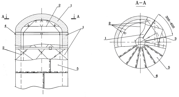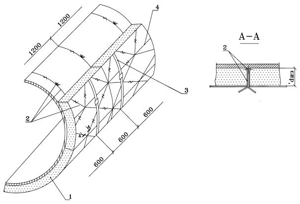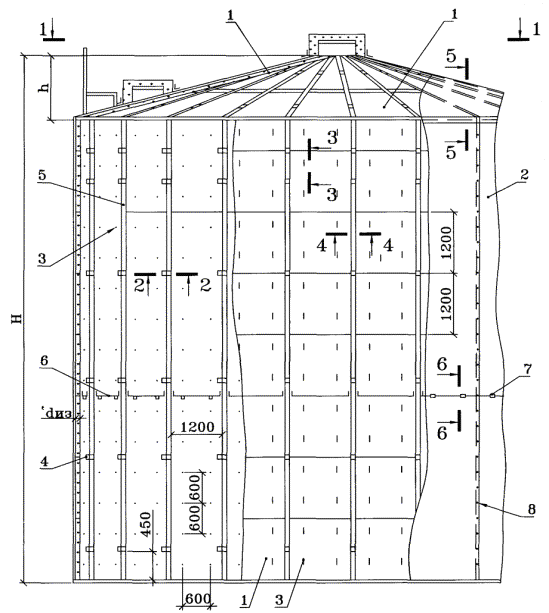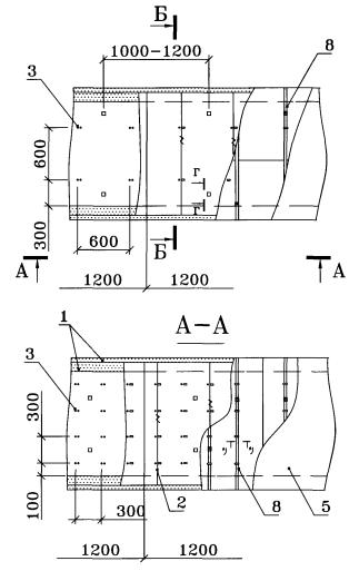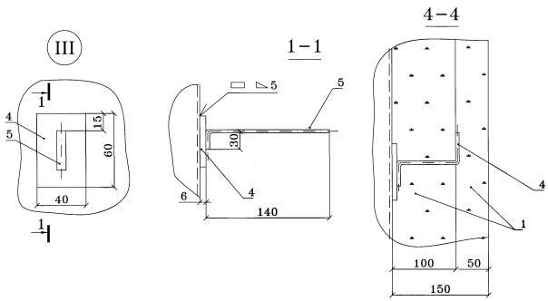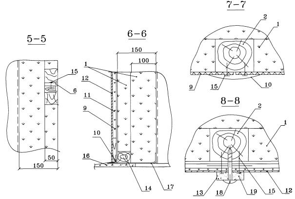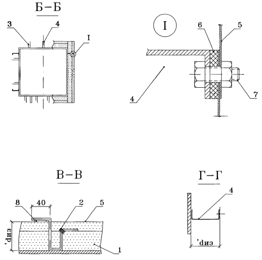 1 - плиты марки «ISOTEC KLS-K» 4 - накладка, приваренная к стенке резервуара 5 - штырь для крепления плит «KLS-K» внутреннего слоя Рис. 33. Разрезы 5-5 - 8-8 к рис. 31.