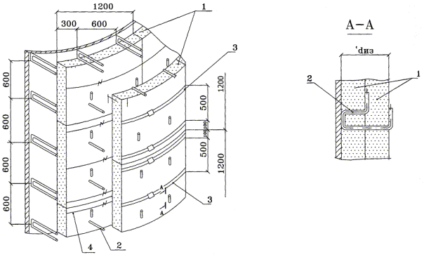 1 - полуфутляр (металлический кожух с замками) с вкладышем из матов «ISOTEC KVM-50», «ISOTEC KIM» или скорлуп «ISOTEC KK» 2 - отделка торца изоляции трубопровода Рис. 14. Конструкция тепловой изоляции на основе матов марки «ISOTEC KT-11-TWIN» для трубопроводов с наружным диаметром теплоизоляционной конструкции не более 200 мм 1 - маты марки «ISOTEC KT-11-TWIN» 2 - покровный слой 3 - кольцо из проволоки диаметром 1,2 - 2,0 мм 4 - спиральное крепление из проволоки диаметром 1,2 - 2,0 мм Скобы устанавливаются на горизонтальные трубопроводы с шагом 500 мм по длине трубопровода. Опорные скобы изготавливают из алюминия или оцинкованной стали (в зависимости от материала защитного покрытия) с высотой, соответствующей толщине изоляции. 4.4.6. На вертикальные участки трубопроводов следует предусматривать разгружающие опорные полки с шагом 3,6 или 4,8 м. 4.4.7. Маты марок «ISOVER KT-11-TWIN», «ISOVER 610-KT-11-TWIN» рекомендуется применять для изоляции арматуры и фланцевых соединений трубопроводов в виде матрацев с обкладками из стеклоткани со всех сторон. Поверх матрацев устанавливается съемный металлический кожух, крепление которого может осуществляться замками, приваренными непосредственно к кожуху, или бандажами с замками, устанавливаемыми поверх кожуха (рис. 15). Матрацы к изолируемой поверхности крепятся бандажами с пряжками и перевязываются проволокой по крючкам. 4.4.8. В зависимости от вида и размеров арматуры матрацы могут быть с крючками или без них (рис. 15). Крючки могут быть изготовлены из проволоки диаметром 2 мм. Ширина матраца из матов марок «ISOVER KT-11-TWIN», «ISOVER 610-KT-11-TWIN» при изоляции фланцевой арматуры и фланцевых соединений трубопроводов должна быть равна длине фланцевого соединения или арматуры, включая присоединительные фланцы, плюс две длины болта, соединяющего фланцевый разъем, плюс не менее чем 200 мм для установки на изоляцию трубопровода или аппарата. При изоляции приварной арматуры матрац устанавливается встык с изоляцией трубопровода под общим покрытием. 4.4.9. Маты марок «ISOVER KT-11-TWIN», «ISOVER 610-KT-11-TWIN» могут быть применены для изоляции арматуры и фланцевых соединений в составе полносборных теплоизоляционных конструкций (футляров или полуфутляров) аналогично рис. 8. Маты в виде матрацев накалываются на шплинты к металлическому кожуху. В другом варианте полносборной конструкции для изоляции арматуры и фланцевых соединений (футляров и полуфутляров) маты крепятся шплинтами к кожуху, при этом со стороны, обращенной к изолируемой поверхности, устанавливается металлическая сетка с мелкой ячейкой, которая также крепится шплинтами. Края сетки заделываются внутрь металлического кожуха. Возможно использование стеклосетки или стеклохолста с температурой применения не ниже, чем температура изолируемой поверхности. 4.5. Конструкции тепловой изоляции на основе плит марки «ISOTEC KLS-K» для трубопроводов4.5.1. Теплоизоляционные плиты марки «ISOTEC KLS-K» с облицовкой с одной стороны стекловойлоком рекомендуется применять для изоляции трубопроводов наружным диаметром 500 мм и более с учетом рекомендаций таблицы 12 при температуре изолируемой поверхности от минус 60 до 250 °С. Плиты марки «ISOTEC KLS-K» рекомендуется применять для изоляции технологических трубопроводов с положительными и температурами на промышленных предприятиях и воздуховодов круглого и прямоугольного сечения систем вентиляции. Плиты могут 