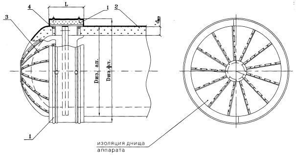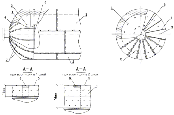 1 - маты марки «ISOTEC KVM-50», плиты марки «ISOTEC KLS-K» 2 - проволочный каркас (кольца, стяжки, струны) 3 - бандаж с пряжкой 4 - опорное кольцо 5 - покрытие 6 - винт самонарезающийся Рис. 17. Изоляция горизонтальных аппаратов матами марки «ISOTEC KVM-50» или плитами марки «KLS-K» в один слой с креплением на проволочном каркасе 1 - маты марки «ISOTEC KVM-50», плиты марки «ISOTEC KLS-K» 2 - проволочный каркас (кольца, стяжки) 3 - бандаж с пряжкой 4 - струны Рис. 18. Изоляция горизонтальных аппаратов матами марки «ISOTEC KVM-50» или плитами марки «KLS-K» в один слой с креплением штырями 1 - маты марки «ISOTEC KVM-50», плиты марки «ISOTEC KLS-K» 2 - штырь 3 - бандаж 4 - пряжка Рис. 19. Изоляция вертикальных аппаратов матами марки «ISOTEC KLS-K» в два слоя с креплением штырями 1 - маты марки «ISOTEC KLS-K» 2 - штырь 3 - бандаж с пряжкой 4 - проволочные кольца по первому слою 4.7. Конструкции тепловой изоляции на основе плит марки «ISOTEC KLS-K» для оборудованияПлиты марки «ISOTEC KLS-K» рекомендуются к применению для изоляции поверхностей с большим радиусом кривизны и плоских поверхностей (резервуаров для хранения нефти и нефтепродуктов, баков-аккумуляторов горячей воды, резервуаров питьевой воды и для технических нужд, в том числе противопожарных, металлические стволы дымовых труб с учетом температуры применения плит, другое крупногабаритное оборудование). Допускается применение плит для изоляции цилиндрического оборудования наружным диаметром от 500 мм. Крепление теплоизоляционного слоя из плит марки «ISOTEC KLS-K» при изоляции оборудования осуществляется, как указано в разделе 4.6 и на рис. 17 - 19. 4.8. Конструкции тепловой изоляции днищ вертикальных и горизонтальных аппаратов с использованием теплоизоляционных матов и плит «САН-ГОБЭН ИЗОВЕл зависимости от диаметра и конфигурации днищ аппаратов крепление теплоизоляционного слоя из матов или плит может осуществляться с помощью: - проволочных стяжек и бандажей или струн из проволоки диаметром 2 мм; - штырей, бандажей или струн. Как правило, одним концом бандажи и струны крепятся к проволочному кольцу, привариваемому или завязанному вокруг патрубка, другим - к проволочному или опорному кольцу (разгружающему устройству), которые устанавливаются у днищ (рис. 20). Рис. 20. Изоляция днищ горизонтальных аппаратов матами или плитами «ISOTEC» с креплением штырями и с металлическим защитным покрытием 1 - маты или плиты «ISOTEC» 2 - металлическое покрытие 3 - штырь 4 - бандаж с пряжкой 5 - проволочное кольцо 6 - опорное кольцо 7 - винт 4.9. Конструкция тепловой изоляции фланцевого соединения аппарата (рис. 21)Люки и фланцевые соединения аппаратов подлежат периодическому осмотру и поэтому для них применяются съемные теплоизоляционные конструкции. Съемные конструкции могут быть полносборные - в виде полуфутляров или футляров и комплектные - в виде матрацев и кожухов. В качестве теплоизоляционного слоя в составе таких конструкций рекомендуется применять маты марок «ISOVER KT-11-TWIN», «ISOVER 610-KT-11-TWIN» или «ISOTEC KVM-50». 4.9.1. В составе комплектных конструкций маты марок «ISOVER KT-11-TWIN», «ISOVER 610-KT-11-TWIN» следует применять в виде матрацев с обкладками со всех сторон из стеклоткани. Матрацы прошиваются стеклонитью или проволокой диаметром 0,8 мм. Матрацы к изолируемой поверхности крепятся бандажами с пряжками. Поверх матрацев устанавливается съемный металлический кожух, крепление которого может осуществляться замками, приваренными не