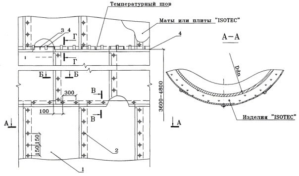 1 - маты марки «ISOTEC KIM-AL» 2 - скорлупы марки «ISOTEC KK-ALC» 3 - проклейка швов клейкой алюминиевой лентой 4 - бандаж с пряжкой 6 - бандаж из клейкой алюминиевой ленты 7 - предохранительный слой 8 - подкладка Рис. 10. Изоляция трубопроводов наружным диаметром 219 мм и более матами марок «ISOROC KIM» и «ISOROC KIM-AL» 1 - маты марки «ISOROC KIM» 2 - маты марки «ISOROC KIM-AL» 3 - клейкая алюминиевая лента 4 - скоба 5 - подвеска 6 - бандаж с пряжкой 7 - проволочное кольцо Рис. 11. Изоляция матами и плитами «ISOTEC» в один слой с креплением бандажами и подвесками 1 - маты марки «ISOROC KVM-50», «ISOROC KIM-AL» или плиты марки «ISOROC KLS-K» 2 - покрытие 3 - бандаж с пряжкой 4 - опорная скоба 5 - подвеска Рис. 12. Конструкция тепловой изоляции на основе матов марки «ISOTEC KIM-AL» для воздуховодов прямоугольного сечения 1 - маты марки «ISOTEC KIM-AL» 2 - проклейка стыков матов алюминиевой клейкой лентой AL-teippi 3 - бандаж с пряжкой 4 - подкладка (алюминиевая клейкая лента AL-teippi, стеклопластик и др.) На трубопроводы наружным диаметром 530 мм и более устанавливаются три скобы по диаметру в верхней части конструкции и одна снизу. Опорные скобы трубопроводов с отрицательными температурами должны иметь прокладку из малотеплопроводного материала (текстолита, деревянных брусков и т.п.). При толщине изоляции 100 мм и более следует применять опорные кольца, которые устанавливаются с шагом 3 - 4 м по горизонтали. Опорные кольца изготавливаются из ленты стальной горячекатаной 2´30 мм с прокладками из асбестового картона. Опорные кольца устанавливаются на трубопроводы диаметром от 219 мм и более. Опорные кольца для трубопроводов диаметром от 530 мм и выше изготавливаются из двух - четырех элементов, которые стягиваются болтами и гайками. Для трубопроводов с отрицательными температурами опорные конструкции должны иметь прокладки из стеклотекстолита, дерева или других малотеплопроводных материалов для ликвидации «мостиков холода». Разгружающие опорные полки устанавливаются с шагом 3,6 или 4,8 м по высоте вертикального участка трубопровода. 4.2.8. Для предотвращения коррозии элементы разгружающих устройств и опорных колец из черной стали должны быть окрашены лаком БТ-577 или кремнийорганическим лаком в зависимости от температуры изолируемой поверхности. 4.2.9. Маты из штапельного стекловолокна на синтетическом связующем марки «ISOTEC KIM-AL» могут быть использованы в конструкциях несъёмной тепловой изоляции для приварной и муфтовой арматуры трубопроводов холодной воды и с отрицательными температурами. При этом арматура изолируется заодно с трубопроводом под общим защитным покрытием. 4.3. Конструкции тепловой изоляции на основе матов марки «ISOTEC KVM-50» для трубопроводов и арматуры4.3.1. Маты марки «ISOTEC KVM-50» рекомендуется применять для изоляции трубопроводов наружным диаметром 273 мм и более с температурой от минус 60 до 280 °С с учетом рекомендаций п. 2.3. Маты могут применяться для изоляции: - технологических трубопроводов с положительными и отрицательными температурами промышленных предприятий; - трубопроводов тепловых сетей при надземной (на открытом воздухе, в подвалах, помещениях) и подземной (в каналах, тоннелях) прокладках; - трубопроводов горячего и холодного водоснабжения в жилищном и гражданском строительстве, а также на промышленных предприятиях; - воздуховодов круглого сечения систем вентиляции; арматуры и фланцевых соединений трубопроводов. 4.3.2.