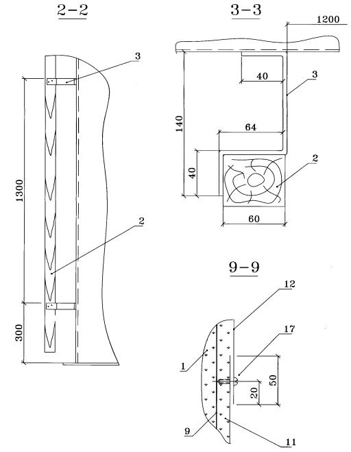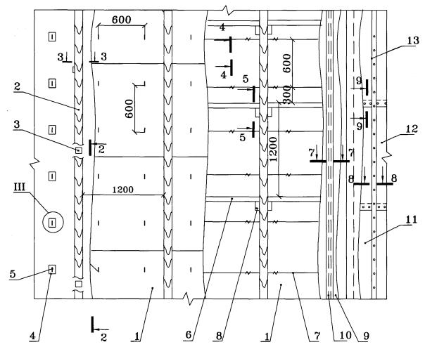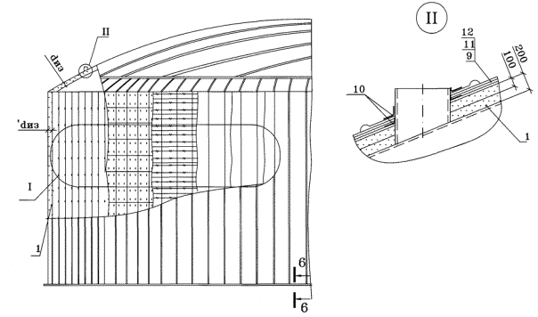 1 - плиты марки «ISOTEC KLS-K» 2 - покрытие 3 - штырь 4 - скоба 5 - стойка 6 - диафрагма 7 - кляммера 1 8 - шуруп Рис. 28. Разрезы 1-1, 4-4, 7-7 к рис. 27. 9 - опорное кольцо из досок 10 - направляющая 11 - кляммера 2 12 - гвоздь Остальные позиции на рис. 4. Рис. 29. Разрезы 2-2, 3-3, 5-5 и 6-6 к рис. 27.