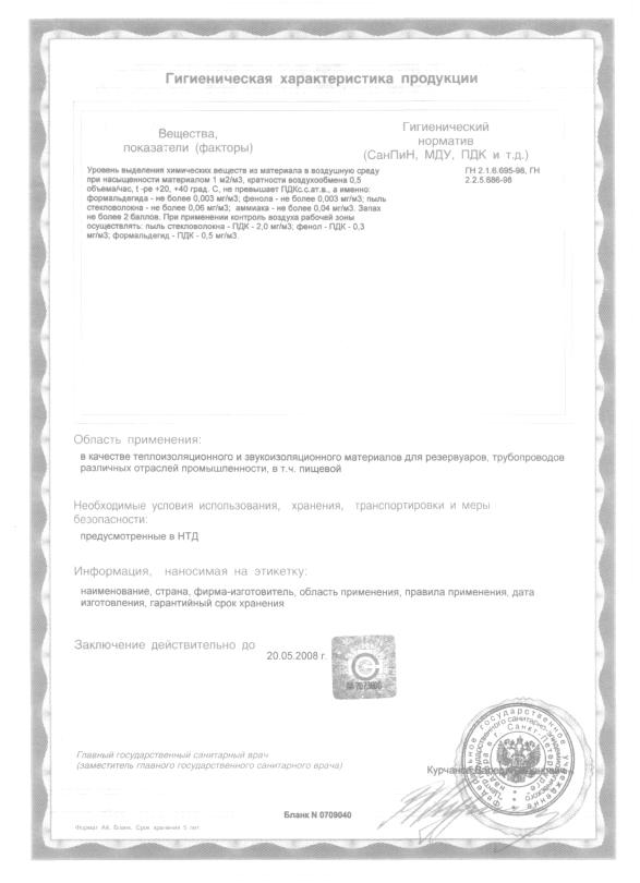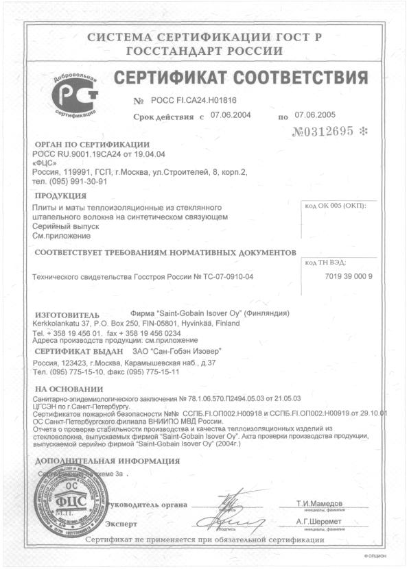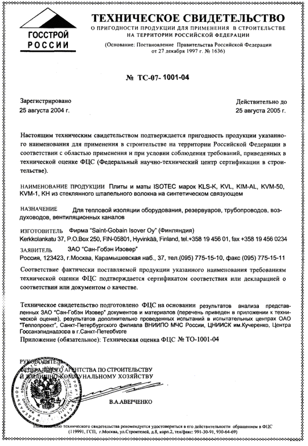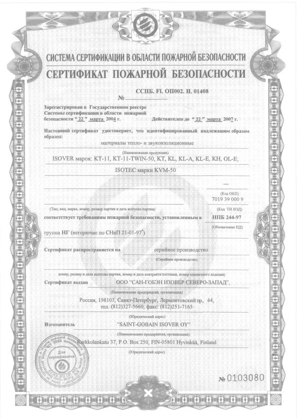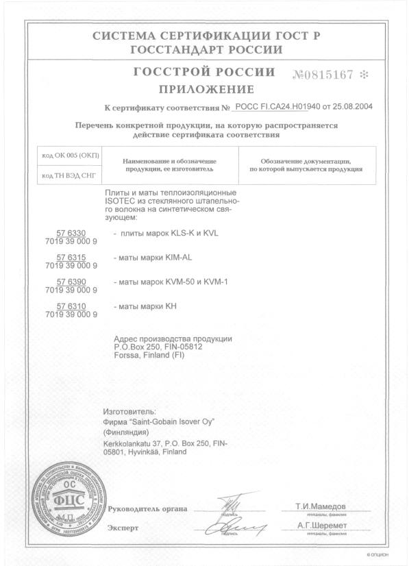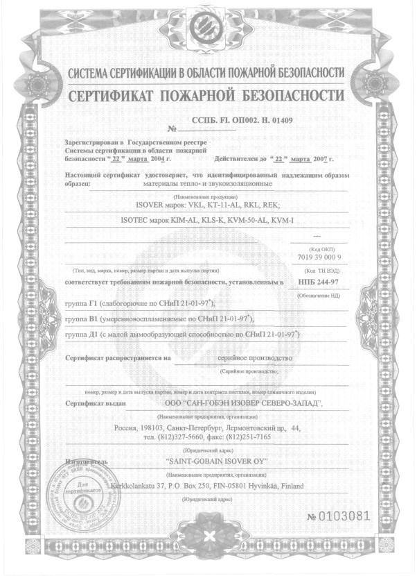 *) теплопроводность определяется при номинальной толщине. 4.8. Плиты и маты должны иметь однородную структуру без пустот, разрывов и расслоений, не содержать посторонних включений. 4.9. Материалы, применяемые для кэширования, должны быть приклеены по всей площади изделий без надрывов, задиров и отслоений. 4.10. Армирующая сетка должна быть равномерно прошита по всей площади матов стальной оцинкованной проволокой. 4.11. Упаковка и маркировка 4.11.1. Маты KIM-AL, KVM-50, KVM-1, КН сворачивают в рулоны, которые затем упаковывают в термоусадочную пленку. Маты КН при рулонировании сжимают до 25 % от номинальной толщины. Упакованные маты укладывают на поддоны, которые могут дополнительно оборачиваться самостягивающейся пленкой. 4.11.2. Каждое упакованное место снабжается этикеткой, содержащей следующие сведения: - наименование предприятия-изготовителя и/или его товарный знак; - наименование и марка продукции; - геометрические размеры; - количество продукции в упаковке (м3, м2 или м.п.); - дата изготовления; - изображение знака пригодности; - другая информация по усмотрению изготовителя. 4.11.3. Плиты и маты отгружают потребителю партиями. Партией считается количество цилиндров одной марки и типоразмера, сопровождаемое одним документом о качестве (паспорт или сертификат). 5. БЕЗОПАСНОСТЬ И НАДЕЖНОСТЬ ПРИМЕНЕНИЯ ПРОДУКЦИИ Условия, обеспечивающие безопасность и надежность применения продукции, должны устанавливаться в проектной (технологической) документации на выполнение работ с применением плит и матов с учетом требований действующих нормативных документов и настоящей технической оценки. При этом: 5.1. Плиты и маты должны применяться в соответствии с требованиями СНиП 41-03-2003, СП 41-103-2000, проектной документацией на производство работ, а также назначением и допускаемой областью применения, указанными в разделе 3 настоящего документа. 5.2. При применении плит и матов должны соблюдаться правила охраны труда и техники безопасности, установленные СНиП 12-03-2001, СНиП 12-04-2002 и другими нормативными документами. 6. ПЕРЕЧЕНЬ ИСПОЛЬЗУЕМЫХ ДОКУМЕНТОВ И МАТЕРИАЛОВ 6.1. Каталог изделий ISOTEC. Фирма «Saint-Gobain Isover Oy», 2000. 6.2. Спецификации продуктов KLS-K, KVL, KIM-AL, KVM-50, KVM-1, КН. Фирма «Saint-Gobain Isover Oy», 2004. 6.3. Сертификат № 125539 от 19.02.03 на систему менеджмента качества по ISO 001:2000. Bureau Veritas Quality International, Роттердам, Нидерланды. 6.4. СНиП 41-03-2003 «Тепловая изоляция оборудования и трубопроводов». 6.5. СП 41-103-2000 «Проектирование тепловой изоляции оборудования и трубопроводов». 6.8. Сертификаты пожарной безопасности № ССПБ.FI.ОП002.Н.01408 и № ССПБ.FI.ОП002.Н01409 от 22.03.04 Санкт-Петербургского филиала ФГУ ВНИИПО МЧС России. 6.9. Сертификат пожарной безопасности № ССПБ.FI.ОП031. от 19.07.04 ОС «Огнестойкость-ЦНИИСК», г. Москва. Эксперт А.Г. Шеремет Настоящий документ действителен до 25 августа 2005 г.