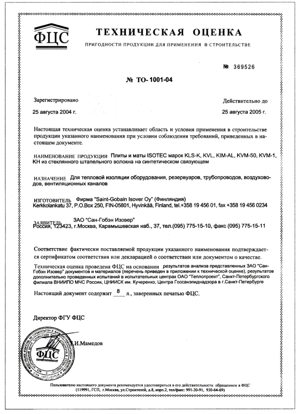 ТЕХНИЧЕСКАЯ ОЦЕНКА ПРИГОДНОСТИ ПРОДУКЦИИ ДЛЯ ПРИМЕНЕНИЯ В СТРОИТЕЛЬСТВЕ № ТО-1001-04 Продукция: Плиты и маты ISOTEC марок KLS-K, KVL, KIM-AL, KVM-50, KVM-1, КН из стеклянного штапельного волокна на синтетическом связующем Изготовитель: Фирма «Saint-Gobain Isover Oy» (Финляндия) Назначение: Для тепловой изоляции оборудования, резервуаров, трубопроводов, воздуховодов, вентиляционных каналов Настоящий документ является приложением к техническому свидетельству Госстроя России № ТС-07-1001-04; содержит 8 л., заверенных печатью ФЦС 1. ОБЩИЕ ПОЛОЖЕНИЯ 1.1. Настоящий документ содержит требования к продукции - плиты и маты ISOTEC марок KLS-K, KVL, KIM-AL, KVM-50, KVM-1, КН из стеклянного штапельного волокна на синтетическом связующем (далее - плиты и маты), предназначенные для тепловой изоляции оборудования, резервуаров, трубопроводов, воздуховодов, вентиляционных каналов. Документ предназначен для использования при разработке в установленном порядке технической документации на продукцию и проектной документации на строительство объектов с её применением. При проектировании и строительстве объектов с использованием указанной продукции должны соблюдаться обязательные требования строительных, санитарных, пожарных, промышленных, экологических, а также других норм безопасности, утвержденных в соответствии с действующим порядком. 1.2. Настоящий документ составлен на основании результатов анализа представленных заявителем документов и материалов (перечень приведен в приложении к технической оценке), результатов дополнительно проведенных испытаний в испытательных центрах ОАО «Теплопроект», Санкт-Петербургского филиала ВНИИПО МЧС России, ЦНИИСК им. Кучеренко, Центра Госсанэпиднадзора в г. Санкт-Петербурге. Документ не устанавливает юридические права заявителя на технические и технологические решения, примененные в продукции. Заявитель несет ответственность за недостоверность и неполноту (сокрытие) информации в представленных им документах и материалах на продукцию, что может привести к снижению уровня безопасности и надежности продукции и объектов с её применением. 1.3. Техническая документация на плиты и маты представлена ЗАО «Сан-Гобэн Изовер» (Россия). 1.4. Плиты и маты изготавливаются фирмой «Saint-Gobain Isover Oy» (Финляндия). 1.5. Плиты и маты необходимо изготавливать только с применением материалов, указанных в настоящем документе. 1.6. ФЦС при получении новой информации о технических, эксплуатационных и иных свойствах плит и матов: - вносит изменения и дополнения в положения, содержащиеся в настоящем документе, или отменяет их; - производит проверку соблюдения фирмой «Saint-Gobain Isover Oy» требований настоящего документа; - при несоблюдении требований настоящего документа, в зависимости от характера допущенных нарушений, подготавливает представление о приостановлении действия или об отзыве технического свидетельства Госстроя России на плиты и маты. 2. ПРИНЦИПИАЛЬНОЕ ОПИСАНИЕ ПРОДУКЦИИ 2.1. Плиты и маты представляют собой изделия из стеклянных штапельных волокон, скрепленных между собой отвержденным синтетическим связующим. 2.2. Для изготовления волокон с температурой плавления не ниже 600 °С применяется силикатное стекло, получаемое из шихты состава, разработанного фирмой «Saint-Gobain Isover Оу» (состав стекла представлен в ФЦС). 2.3. В качестве связующего при производстве плит и матов прим